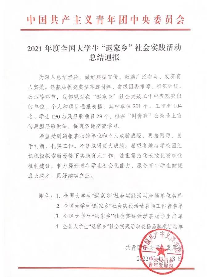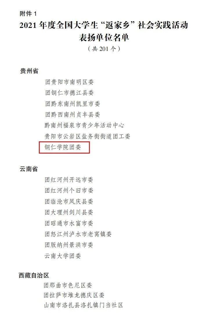 近日,共青团中央发布了2021年度大学生“返家乡”社会实践活动总结通报,对表现突出集体、个人和项目进行表扬。beat365英国官方网站团委获评2021年度全国大学生“返家乡”社会实践活动表扬单位,也是贵州省唯一荣获此表彰的高校团委。
