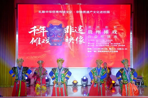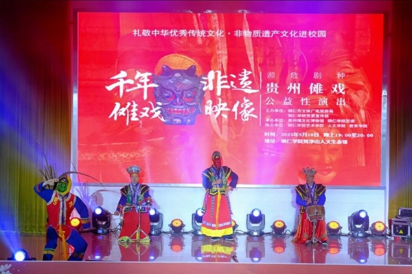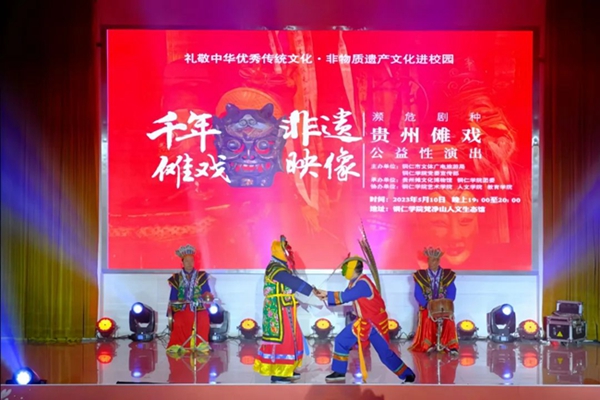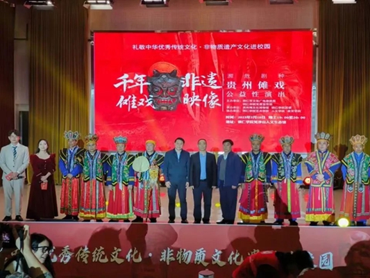 5月10日晚,“礼赞中华优秀传统文化·非物质文化遗产进校园——濒危剧种贵州傩戏公益性演出”在beat365梵净山人文生态馆举行。铜仁市文体广电旅游局党组成员、市文化市场综合执法支队支队长张文,贵州傩文化博物馆馆长唐治洲,beat365艺术学院党委书记徐美、校团委副书记张朝飞出席,师生齐聚一堂共同欣赏铜仁本地的特色非遗文化——傩戏。本次演出由铜仁市文体广电旅游局、beat365党委宣传部主办,贵州傩文化博物馆、beat365团委承办,beat365艺术学院、人文学院、教育学院协办。
