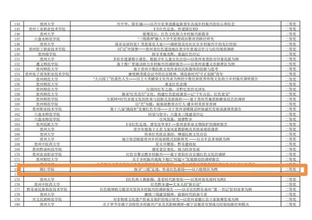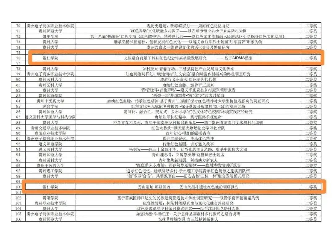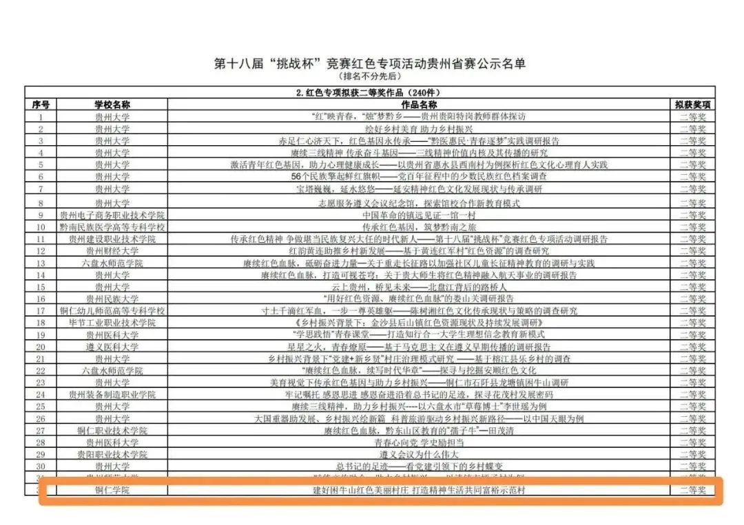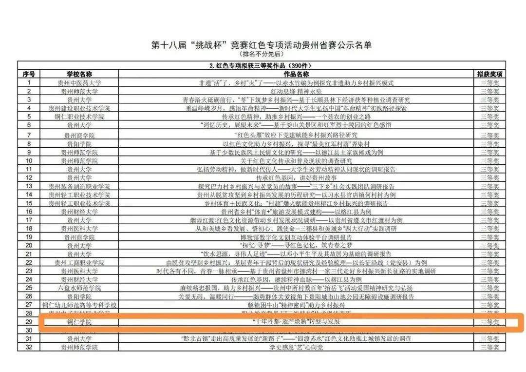 近日,团省委公示了第十八届“挑战杯”全国大学生课外学术科技作品竞赛红色专项活动贵州省赛拟获奖名单。其中,beat365拟获一等奖作品2件、二等奖作品6件、三等奖作品10件。