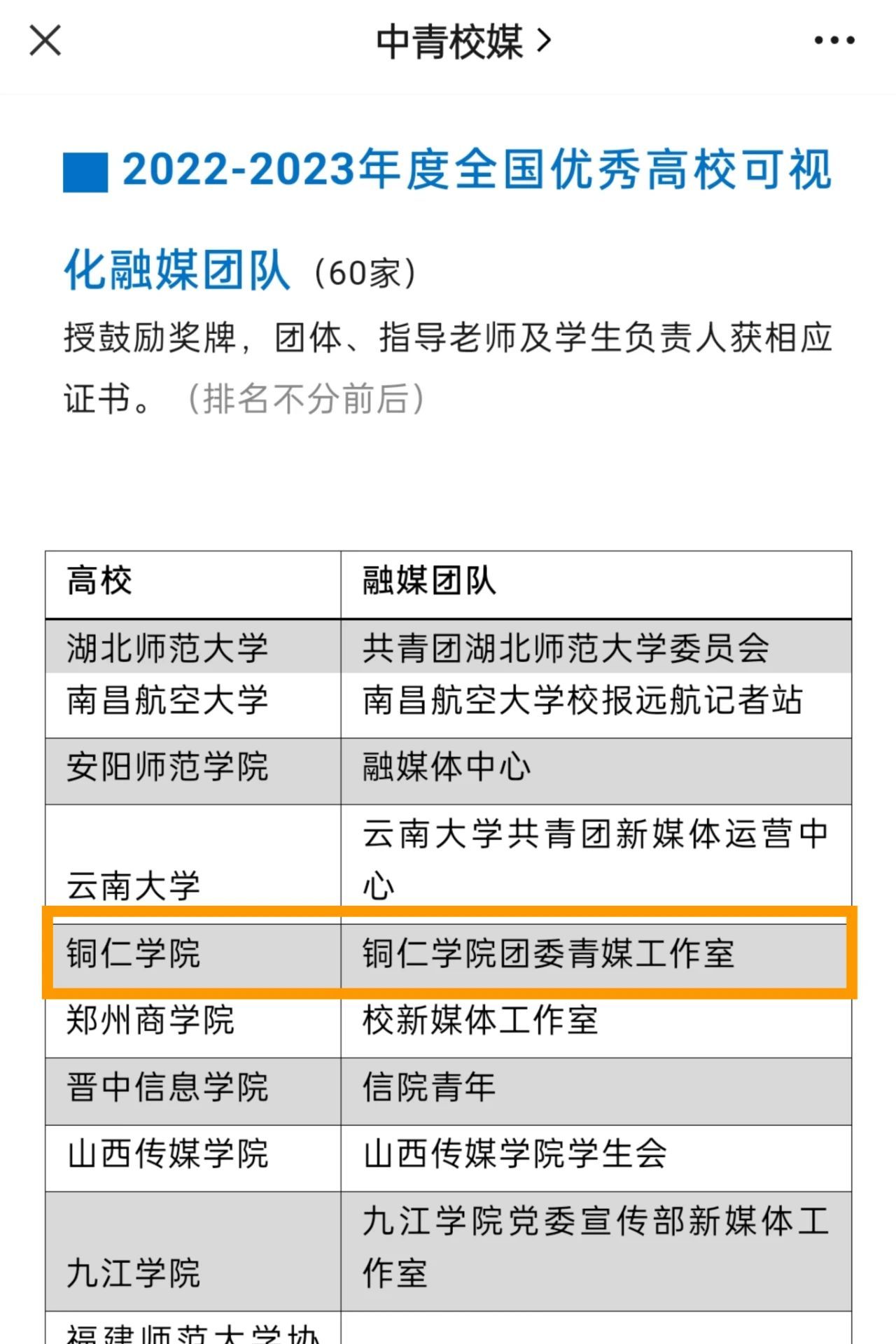 校团委深度挖掘青年学生心理需求及新媒体运营规律,创新构建“四步工作法”,围绕立德树人根本任务,立足校园文化生活,联动校园内外多方利益相关主体,打造铜院团属新媒体矩阵,用无数精彩推文及短视频说好“铜院青年”故事,全方位展示学校育人工作成果,是全省高校新媒体群中极具战斗力,充满正能量的团队。