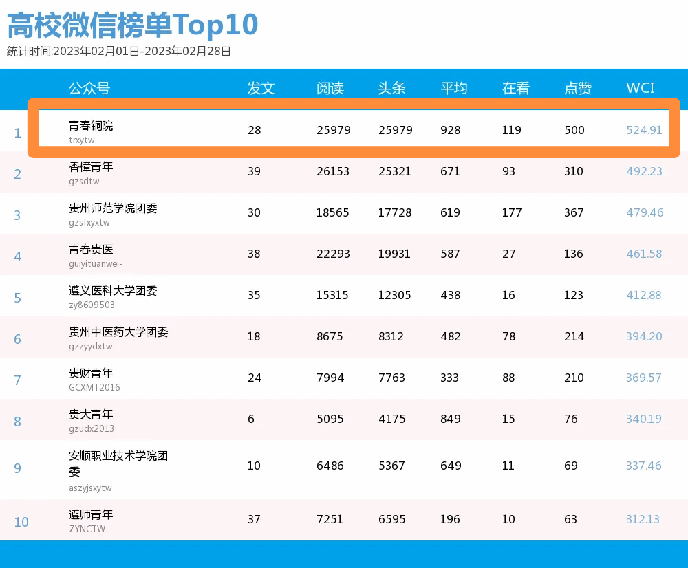 “青春铜院”微信公众号粉丝量2.1万余人,共青团贵州省委发布的微信公众号月排行榜统计显示,“青春铜院”微信公众号每期排名均稳定居于全省前10,最好成绩全省第一,全国第49名;“beat365英国官方网站团委”视频号加入“中青校媒”视频号影响力排行榜以来,每周均进入全国百强名单,全国高校最好排名成绩为全国第4名,为全省本科院校中唯一进榜高校;抖音平台“青春铜院”粉丝量达2.1万余人,关注量为全省高校团属抖音号首位,单条短视频最高播放量接近4000万,单条点赞量最高131万,QQ平台“青春铜院”4000+个粉丝,访客量101万+,微博平台“共青团beat365英国官方网站委员会”粉丝量4600+,小红书平台“青春铜院”成立两个月粉丝量达800+,原创短视频及推文曾先后被腾讯新闻、央视快手、央视抖音、中青校园、共青团贵州省委、贵州日报、动静贵州、天眼新闻等推送报道。