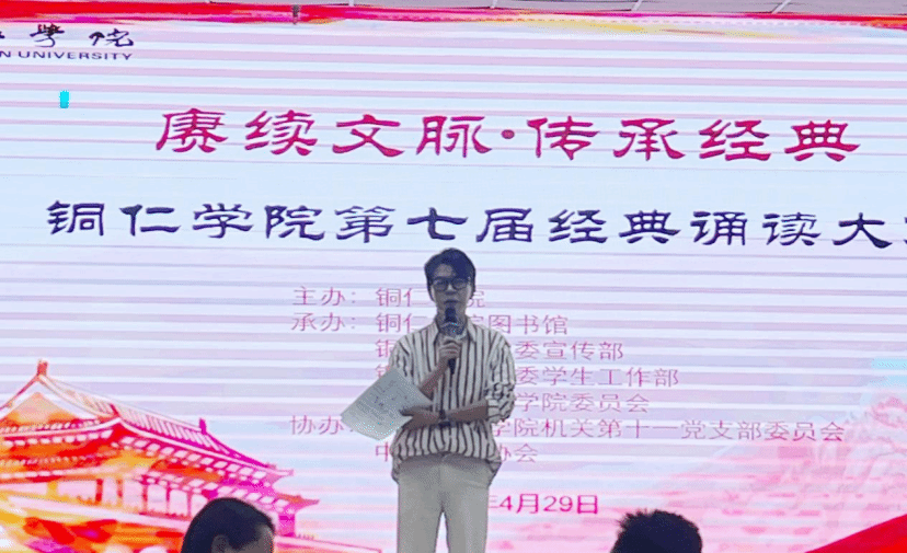 4月29日,由图书馆、党委宣传部、党委学工部、团委联合承办的beat365英国官方网站第七届“赓续文脉·传承经典”经典诵读大赛在图书馆举办。党委宣传部副部长梁光华、党委学工部副部长武国丽、团委副书记田淼、文学与传媒学院副教授刘太胜、党委学工部德育科科长黄橙紫担任评委。图书馆馆长田黎星,副馆长江腾、邹志洪,部分教职工和学生代表到场观摩比赛。
