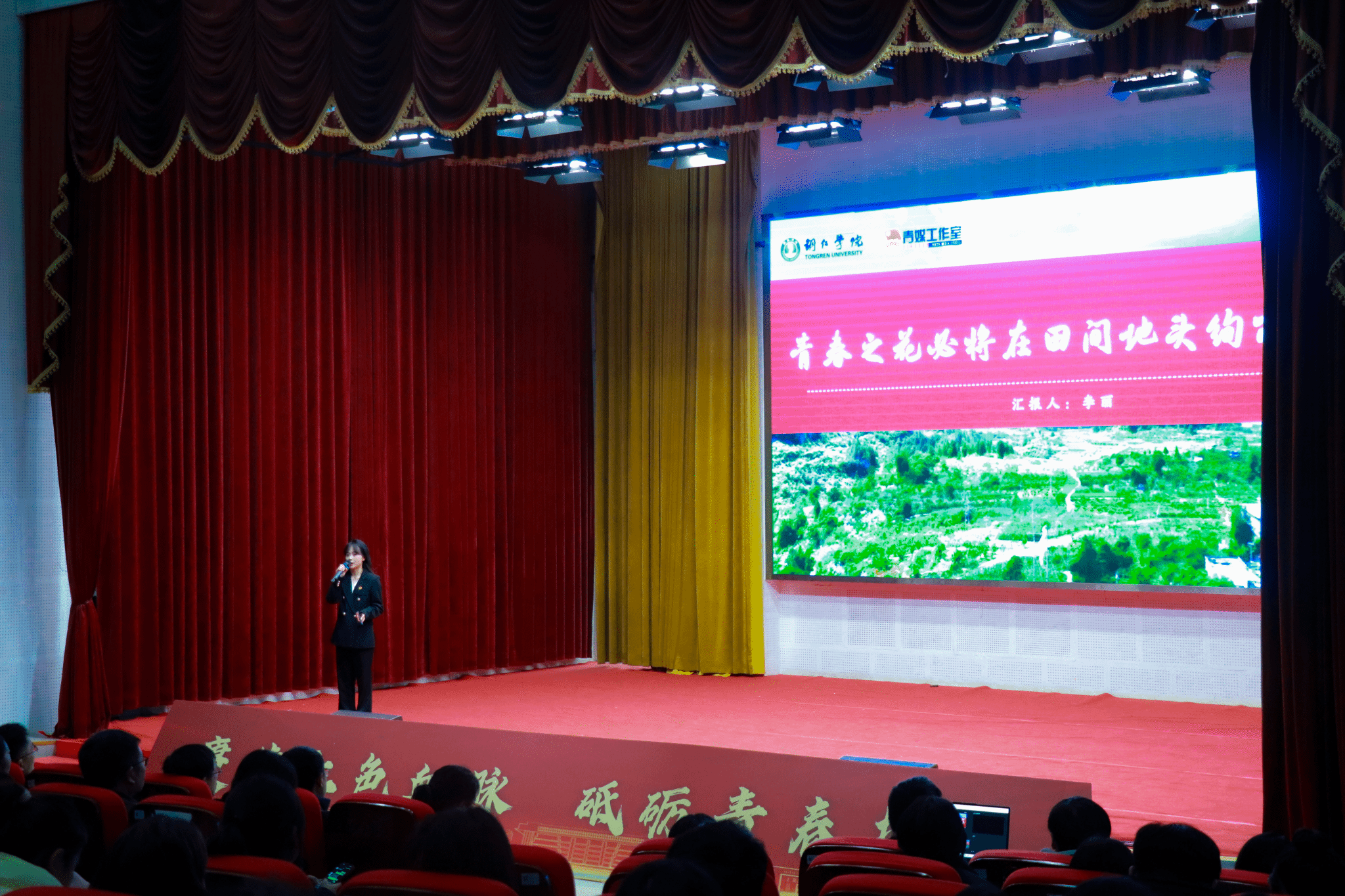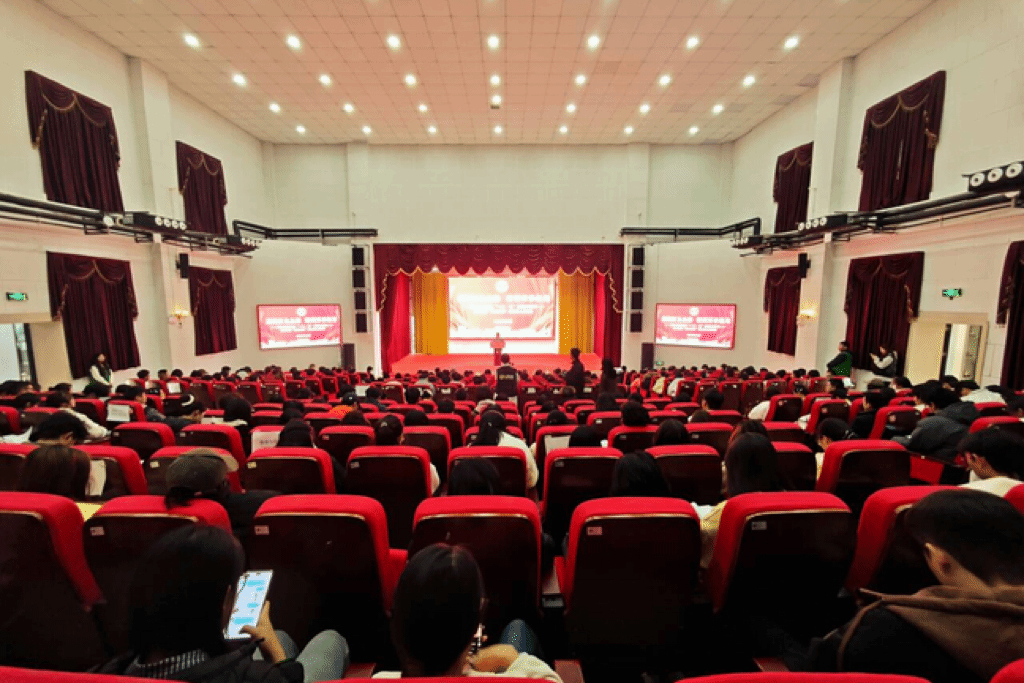 成果展示环节分为五个篇章,全面呈现了学校第二课堂实践育人成果。在“红色青春·理想铸魂”篇章,微团课《一封家书》通过情景再现方式,展现了青年学子的思想升华与使命担当;“紫色青春·创新创业”篇章中,挑战杯国赛三等奖获奖项目《铝程新源——户外电源的铝电革命》团队代表朱红颖同学分享了将爱国热情转化为科技报国的实际行动;“绿色青春·志愿同行”篇章邀请优秀志愿者周敏同学讲述了支教、助老等服务中的感人故事;“蓝色青春·社会实践”篇章展示了《互联网+云端助农》品牌项目,体现学子将专业知识转化为服务社会的实践能力;“橙色青春·美育浸润”篇章中,大学生艺术团的啦啦操表演以艺术形式传承“一二·九”运动精神。