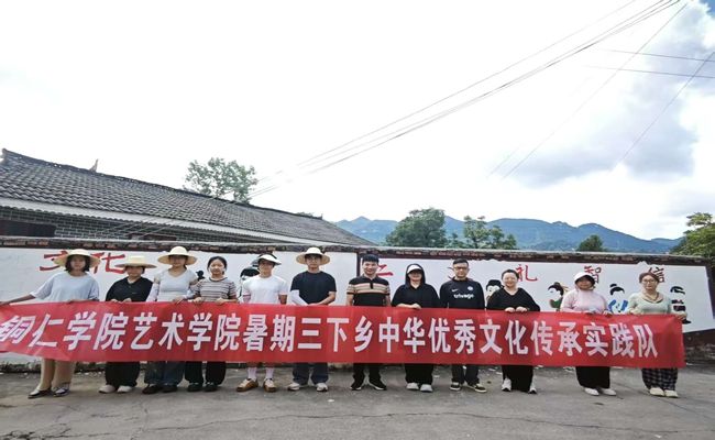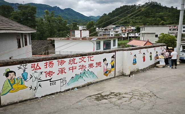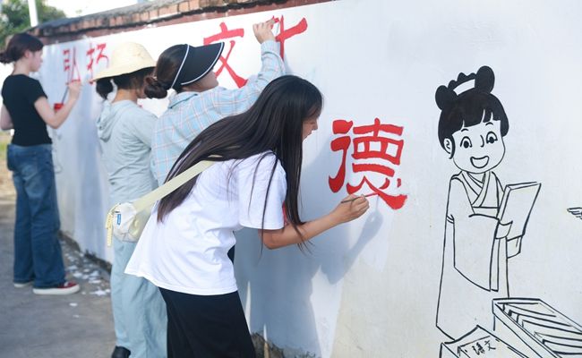 2025年7月2日至3日,beat365英国官方网站艺术学院暑期“三下乡”中华优秀文化传承实践队由两名教师与八名学生组成的队伍走进德江县潮砥镇营盘村,进行为期两天的社会实践活动,队伍主要通过墙绘形式传递优秀传统文化内容。以墙画为笔、以文化为墨,在乡村的白墙上勾勒出一幅幅绚丽多彩的画卷,让中华优秀传统文化在乡村振兴的征程中焕发新的生机。