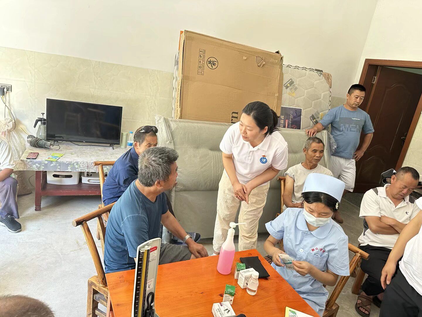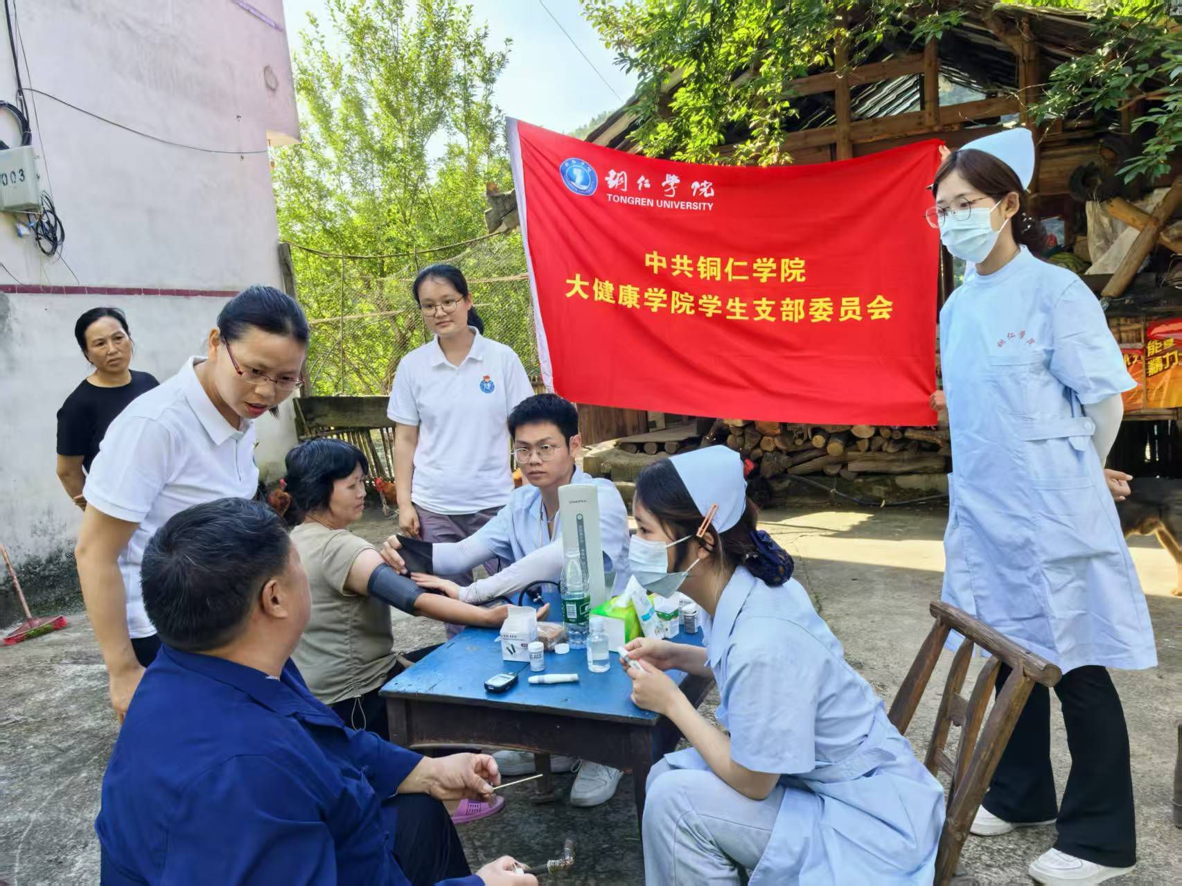 第三天上午,由大健康学院学生科郭易可老师、牛郎镇四茶园村张书记带队,护理系印双红、田芬、李寅翠、蔡春连等教师分三组深入木寨村中,带领护理系学生为村民开展免费血糖、血压检测服务,并结合健康宣教关于高血压和糖尿病的预防,将专业护理实践与乡村振兴需求深度融合。