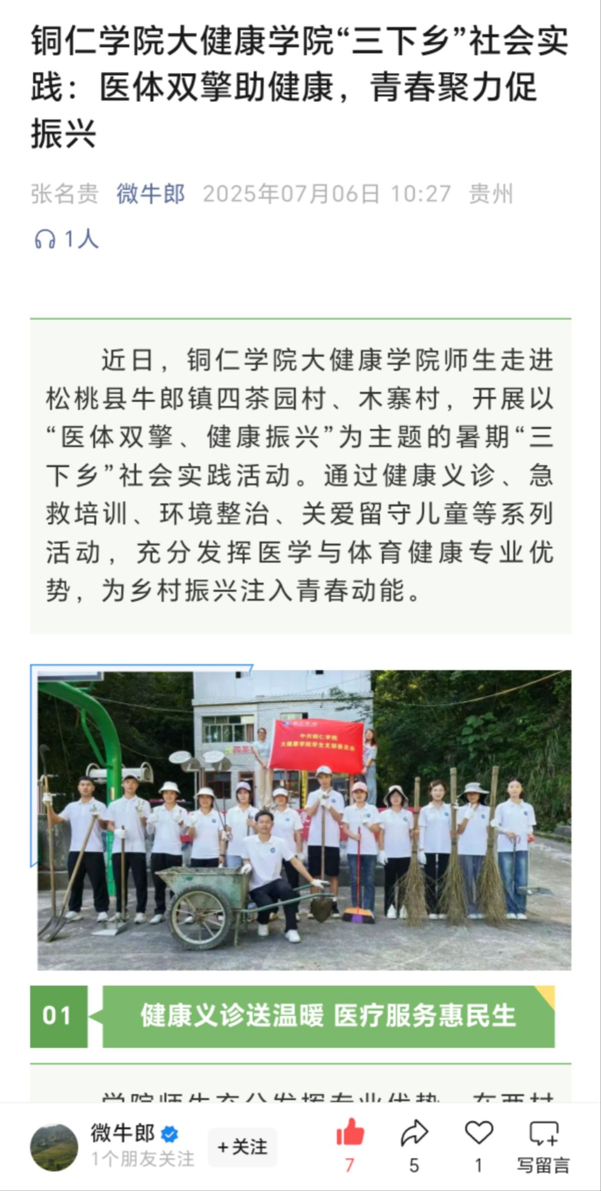 为深入学习贯彻习近平新时代中国特色社会主义思想,扎实推进乡村全面振兴,助力“健康中国”,争做有理想、敢担当、能吃苦、肯奋斗的新时代好青年。近期,由beat365英国官方网站大健康学院18名师生组成的“医体双擎·健康振兴”团队在学院领导的支持下,深入松桃苗族自治县牛郎镇开展暑期“三下乡”社会实践活动。