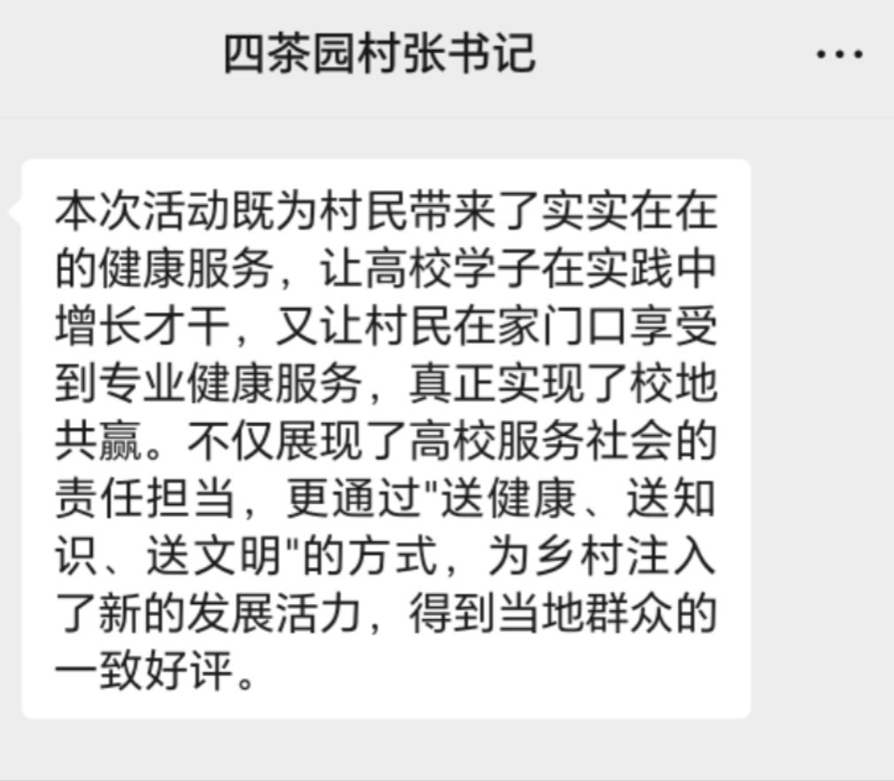 活动期间,师生们充分发挥医学与体育健康专业优势,通过健康义诊、急救培训等方式,为村民带来了实实在在的健康服务,让村民在家门口就能享受到专业医疗资源;在环境整治活动中,大家手持劳动工具,积极清理乡村环境,助力乡村面貌焕新;此外,师生们还特别关爱留守儿童,给他们送去温暖与关怀。驻村第一书记对本次活动给予高度评价,认为活动不仅让高校学子在实践中增长了才干,还实现了校地共赢,充分展现了高校服务社会的责任担当。通过 “送健康、送知识、送文明”,为乡村发展注入了新活力,得到了当地群众的一致好评。此次 “三下乡” 活动,为乡村振兴注入了青春动能,也为高校与乡村的合作交流搭建了良好平台。活动最后四茶园村村民自发与团队师生共同置办了一顿丰盛的午餐。