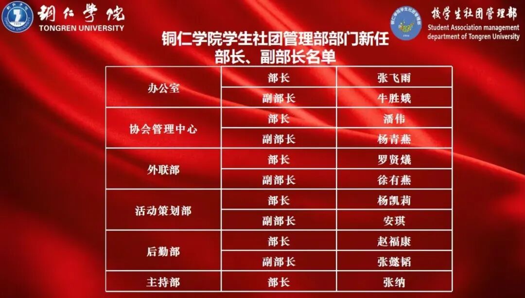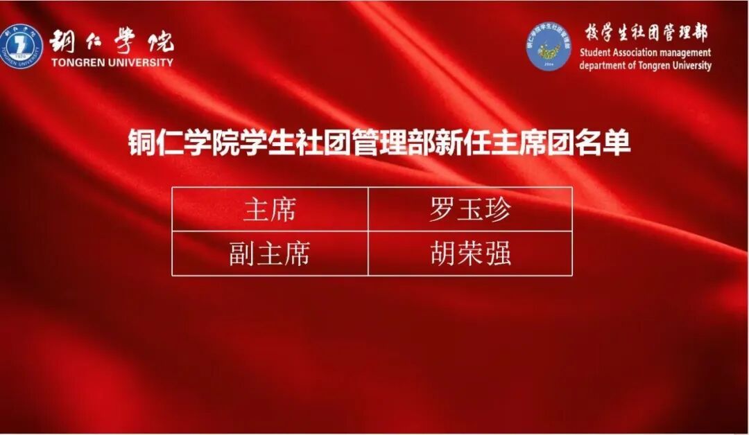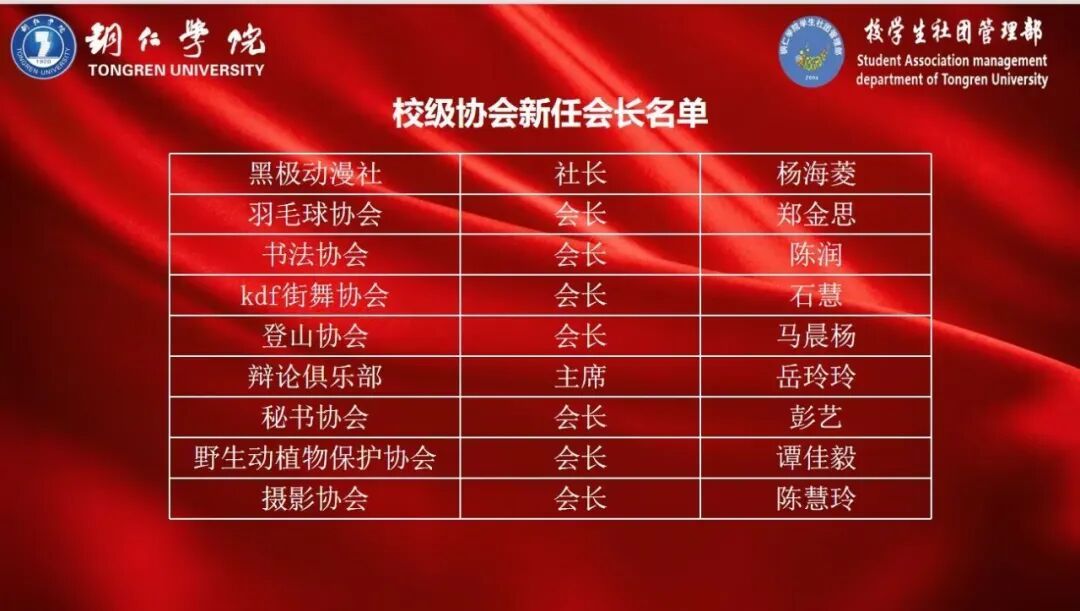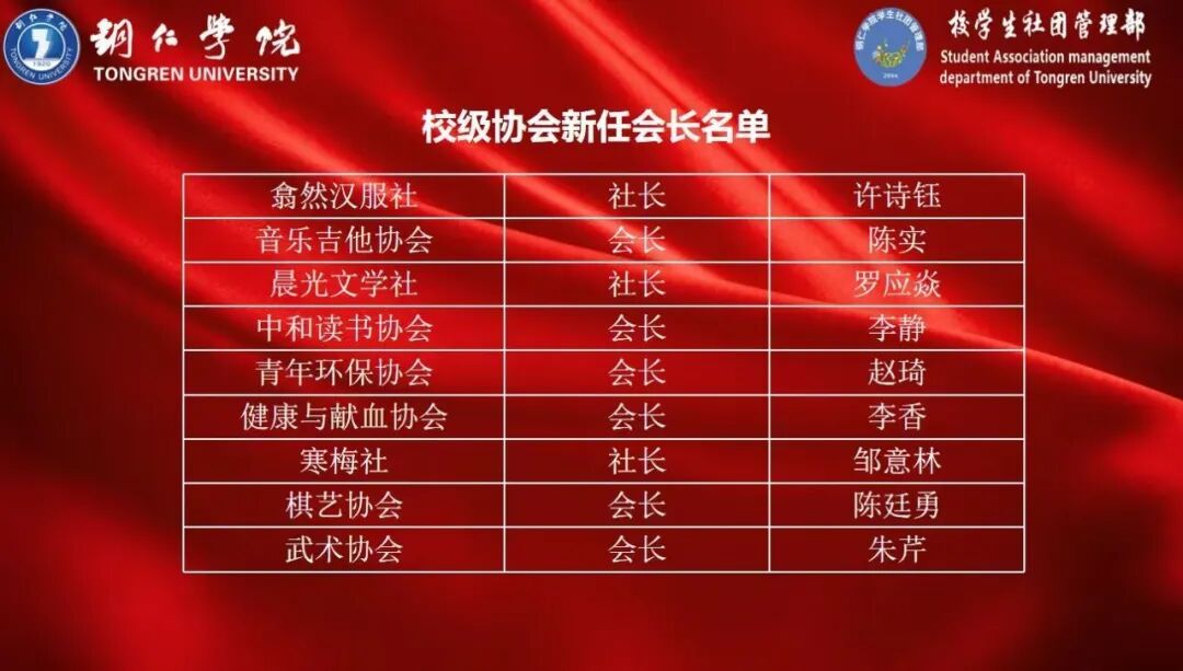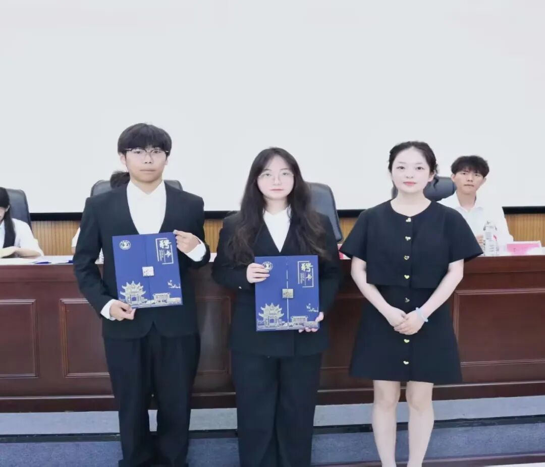 随后,在一阵掌声中,主持人宣读了新任主席团、部长团和会长团名单。指导老师徐秋逸、上一届主席团成员王庭东、杨浩、李宏玉为新任主席团、部长团和协会会长团颁发聘书。