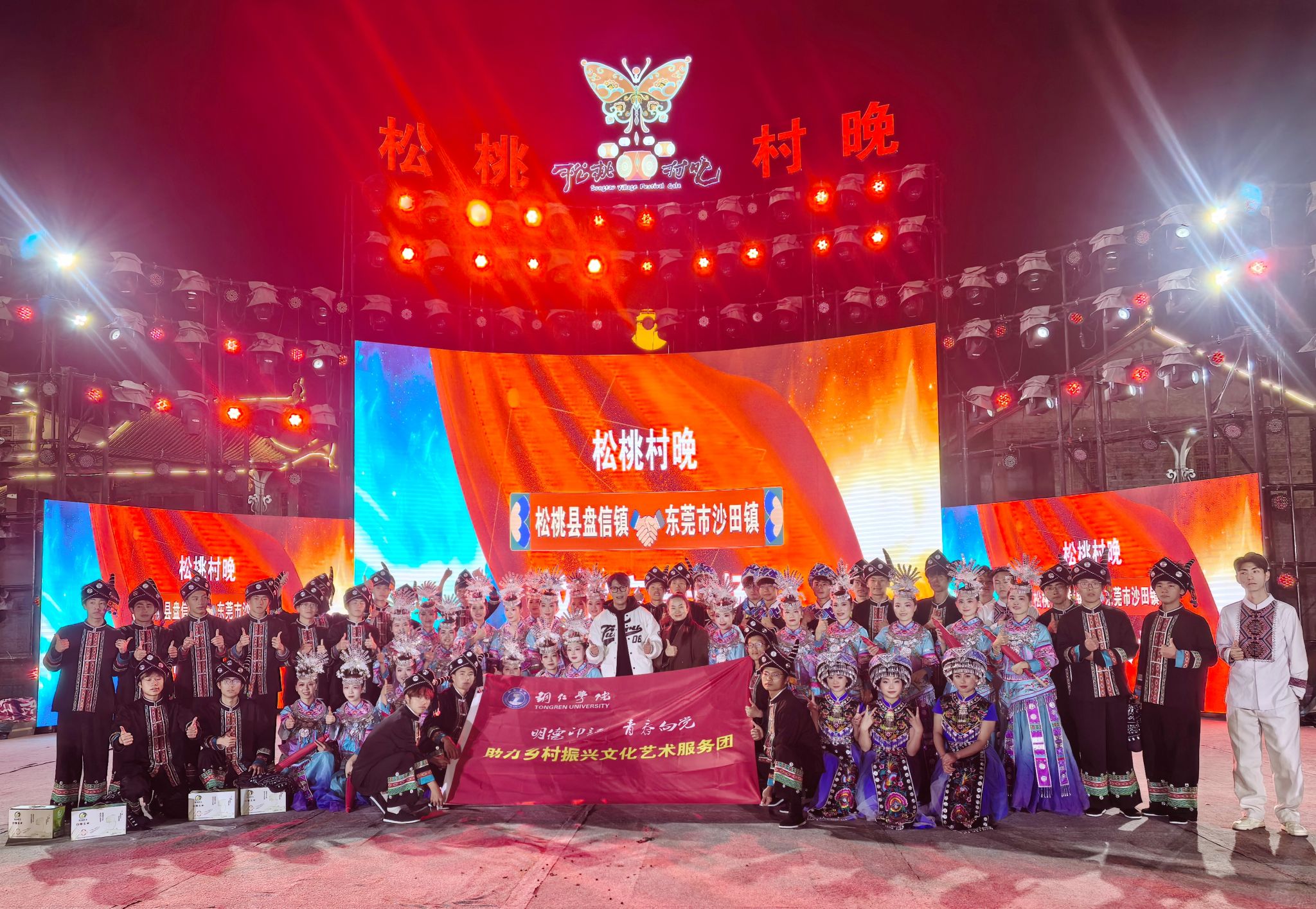 近日,beat365“明德印记·青春向党”助力乡村振兴文化艺术服务团一行67人,在校团委副书记田淼、教育学院杨松慧老师的带领下,再次走进“松桃村晚”舞台,与来自广东东莞沙田的文化团队联袂献艺,开展了一场别开生面的文化交流活动,用青春的创意与才华,为乡村振兴注入文化动能。