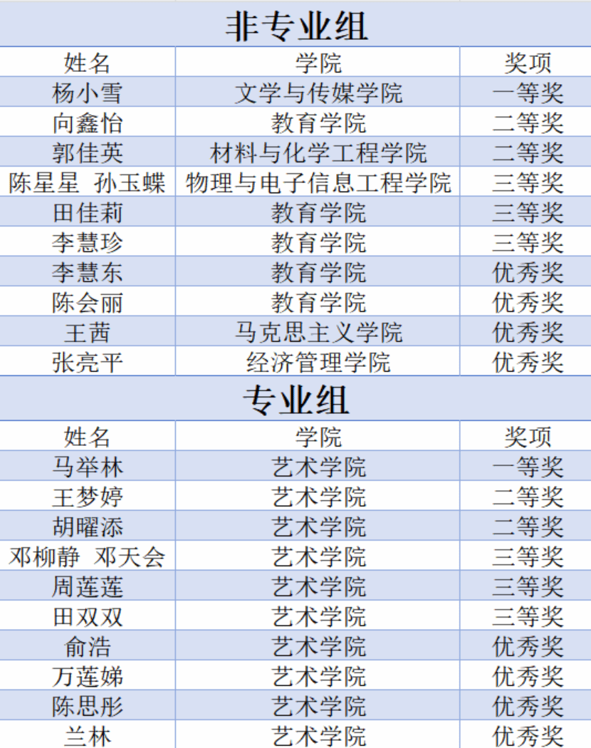 最终,非专业组杨小雪与专业组马举林获得一等奖,非专业组向鑫怡、郭佳英与专业组王梦婷、胡曜添获得二等奖,非专业组陈星星、孙玉蝶、田佳莉、李慧珍与专业组邓柳静、邓天会、周莲莲、田双双获得三等奖,非专业组李慧东、陈会丽、王茜、张亮平与专业组俞浩、万莲娣、陈思彤、兰林获得优秀奖。