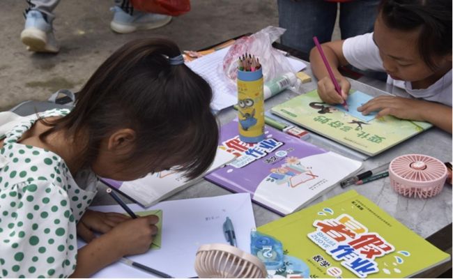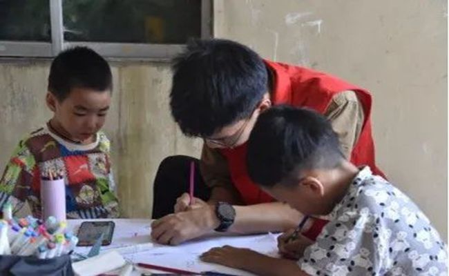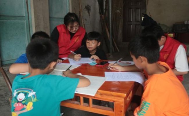 (志愿者为孩子们进行学业辅导)