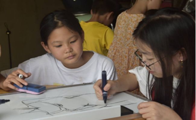 手工课上,志愿者带领小朋友们折纸,孩子们热情高涨,认真听志愿者的讲解,仔细观察志愿者的动作。在志愿者一遍又一遍的耐心教学下,一只只生动形象的千纸鹤、青蛙和龙猫活呈现在每一位小朋友的手上;绘画课上,志愿者拿出准备好的绘画材料,孩子们发挥自身想象力,开始在画纸上精心创作,孩子们用纯真的童心、灵巧的小手和充满想象的笔绘出一幅幅色彩斑斓、风格多样的作品。他们拿着自己精心创作的作品,迫不及待地向志愿者们展示,脸上洋溢着幸福的笑容。为了让孩子们更好地享受自我创作的乐趣,志愿者充分发挥自身学识,积极融入孩子队伍中,与孩子们一起折纸绘画,鼓励孩子们相互学习与合作,课堂在欢乐又温暖的氛围中圆满结束。