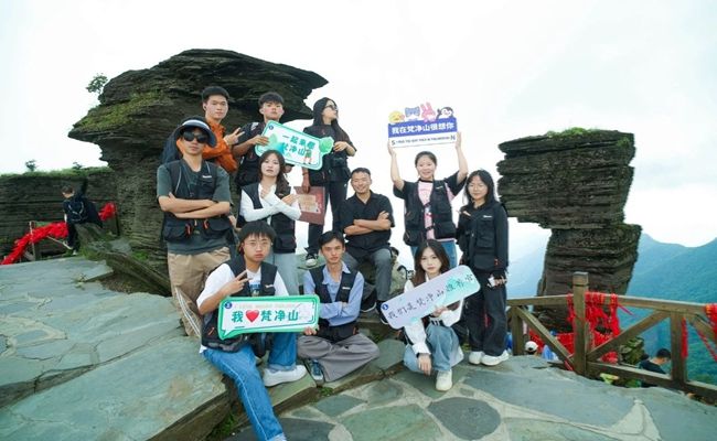 为深入学习贯彻习近平新时代中国特色社会主义思想和党的二十大精神,帮助广大青年学生上好与社会实践相结合的“大思政课”,坚定理想信念,听党话、跟党走,引导和帮助青年大学生在社会课堂中受教育、长才干、作贡献,7月8日至9日,在校团委副书记张朝飞的带领下,由青媒工作室10名青年大学生组成的“铜仁文旅推荐官”实践队来到梵净山风景区开展公益直播推介、宣传视频拍摄、为游客免费拍照等社会实践活动。