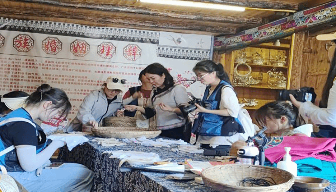 (2024年7月6日,党委宣传部新媒体中心“黔韵传声”实践队在苗王城体验苗族刺绣)