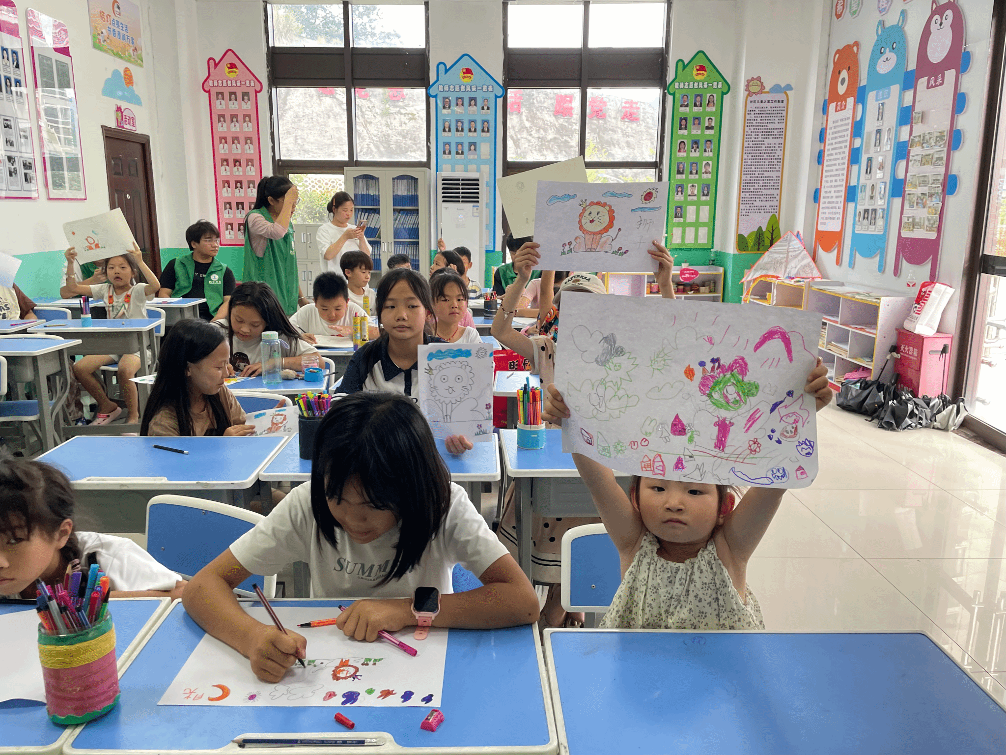 “艺术创作”则成为了孩子们释放天性的舞台。志愿者们带来了绘画、手工等活动内容,激发孩子们的创造力与好奇心。在绘画课上,小朋友跟随着志愿者的绘画步伐,描募了一幅狮子王的绘画作品。在绘画中,小朋友感受到绘画的无限趣味,志愿者能从孩子们笑容洋溢的脸上感受到回馈。
