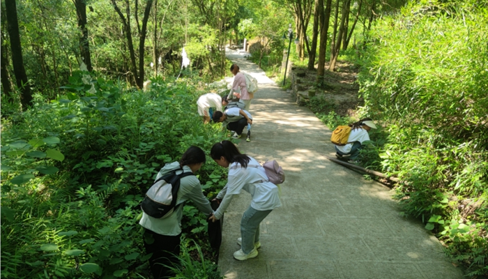 文笔峰公园坐落于铜仁城南的对岸,其峰高直入云端,陡峭如削,是铜仁市人流量较大的健身公园。宣讲成员来到文笔峰公园,身着马甲、带着劳动工具,积极投入到环境清洁行动中,对健身步道两旁和垃圾桶旁边的垃圾进行清洁扫除。
