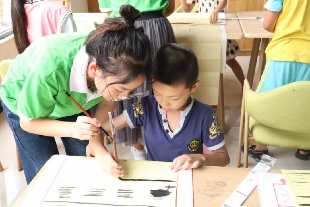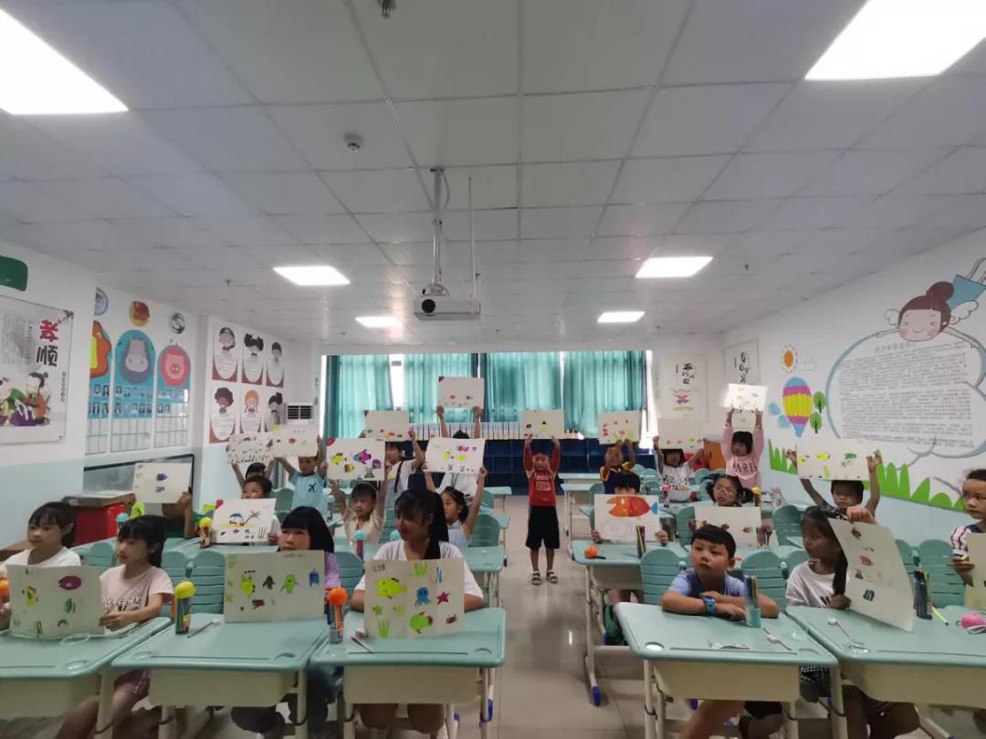启动仪式结束后,志愿者们把报名的学员分成三个不同的兴趣班——书法班、绘画手工班和朗诵班,分班完成后,志愿者们带领自己的学员来到各自的教室开始上课。绘画班的志愿者们以“五彩缤纷的鱼”为主题,带领孩子们创造了一幅幅生动有趣的海洋作品;朗诵班的志愿者们以一首现代诗《我喜欢》打开了孩子们的朗诵之门,带领朗诵班的孩子们徜徉在情感的世界里;书法班的志愿者们则带着孩子们先认识软笔书写的工具,并尝试着正确提笔书写。志愿者们运用自己的专业知识,很快带领孩子们融入各类兴趣课程的学习氛围中。