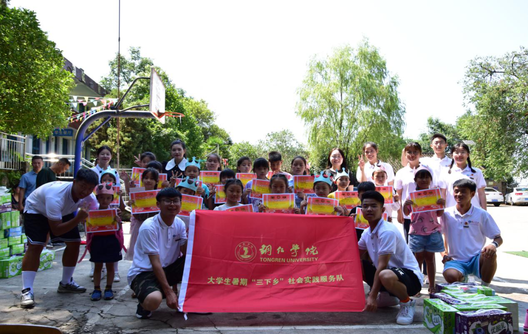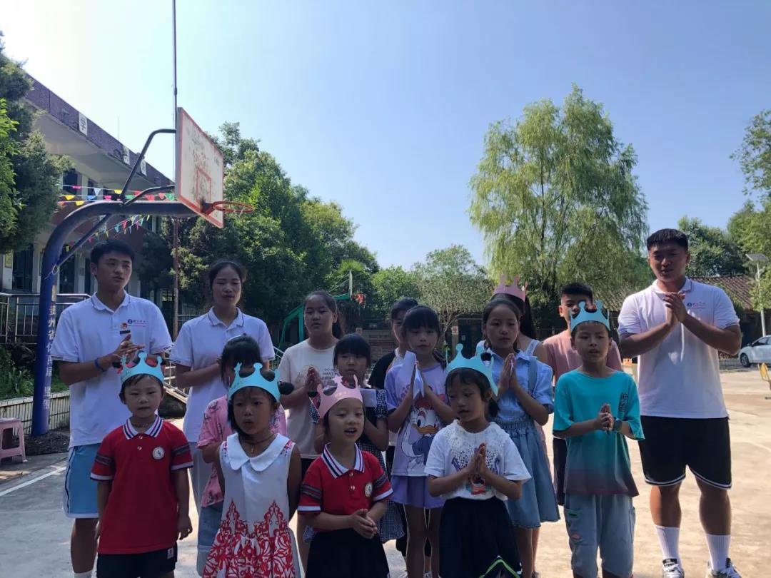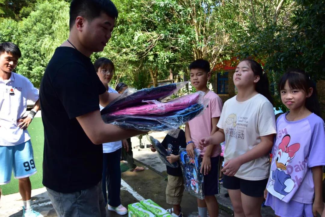 (凉湾村委书记杨江波发表讲话) (指导老师钟琦老师发表讲话) 随后带队指导老师钟琦老师、凉湾村委会书记杨江波发表讲话,在讲话中,他们都着重强调了关爱留守儿童专项计划的重要性以及在生活中我们应怎样尽自己最大努力去关爱留守儿童的相关问题。 (分蛋糕) 随后在唱歌、朗诵表演结束后,志愿者们提前准备了生日蛋糕给小朋友们过集体生日。在合唱生日祝福歌、分蛋糕过程中,小朋友们显得格外兴奋,一个个都露出了天真高兴的笑容。紧接着,爱心人士在活动最后开展了捐赠活动,共捐赠牛奶55箱,书包、文具盒若干,小朋友们在得到礼物后,纷纷对叔叔阿姨的关爱和帮助表示感谢,并希望自己将来也能够成为对社会有用的人。最后,志愿者们根据这几天小朋友们的表现,分别给每个小朋友颁发了奖状和礼品,并对他们的未来寄予厚望。 (合影) 通过这短短十天的社会实践活动,志愿者们更加认识到了十九大报告提出的乡村振兴战略的重要性。虽然在这十天里有累、有苦,但是志愿者们却感到无比充实和幸福。志愿者们纷纷表示在今后的生活中也将会继续弘扬"奉献、友爱、互助、进步"的志愿服务精神,继续关爱、关注留守儿童。编辑丨石佳雅(beat365英国官方网站青媒工作室)终审丨周倩(beat365英国官方网站团委)