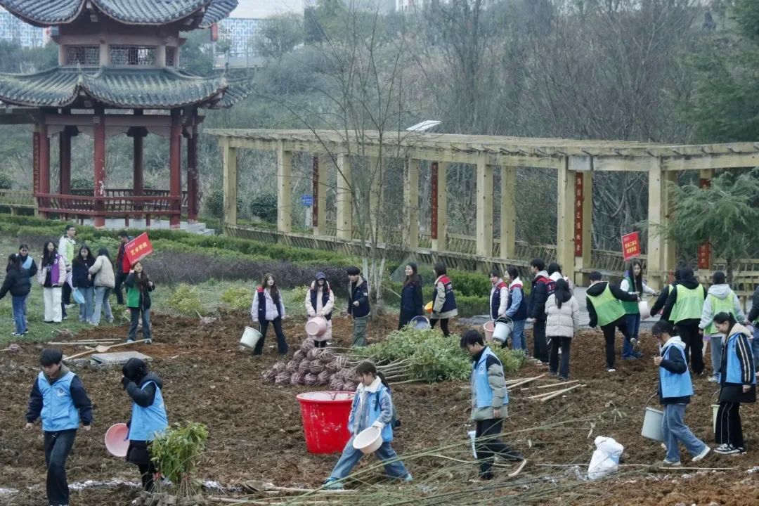 在举行简短的启动仪式后,植树活动正式开始。各学院师生按照划定区域,分工协作,相互配合。挥锄挖坑、扶苗填坑、培实新土、浇水定根……大家热情高涨,干劲十足,将一棵棵小树苗稳稳地种植在铜院的土地里。此次活动,大家积极投身植树护绿行动当中,用劳动诠释着对铜院的热爱,在活动中享受自然的春意。