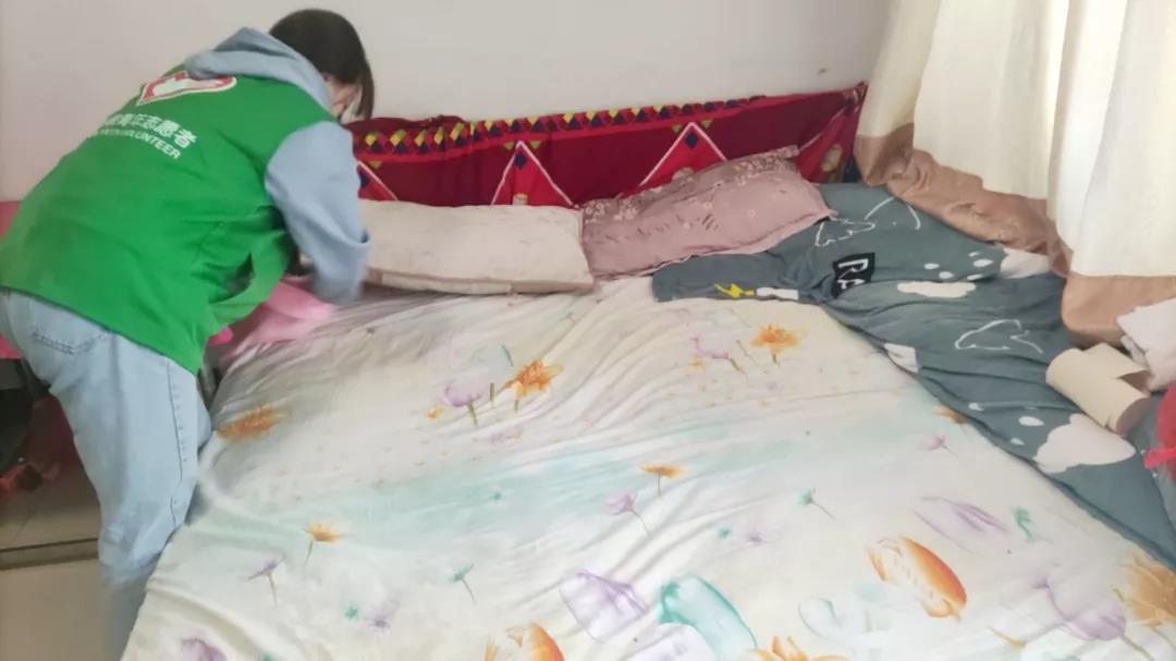 (志愿者细心整理床铺)