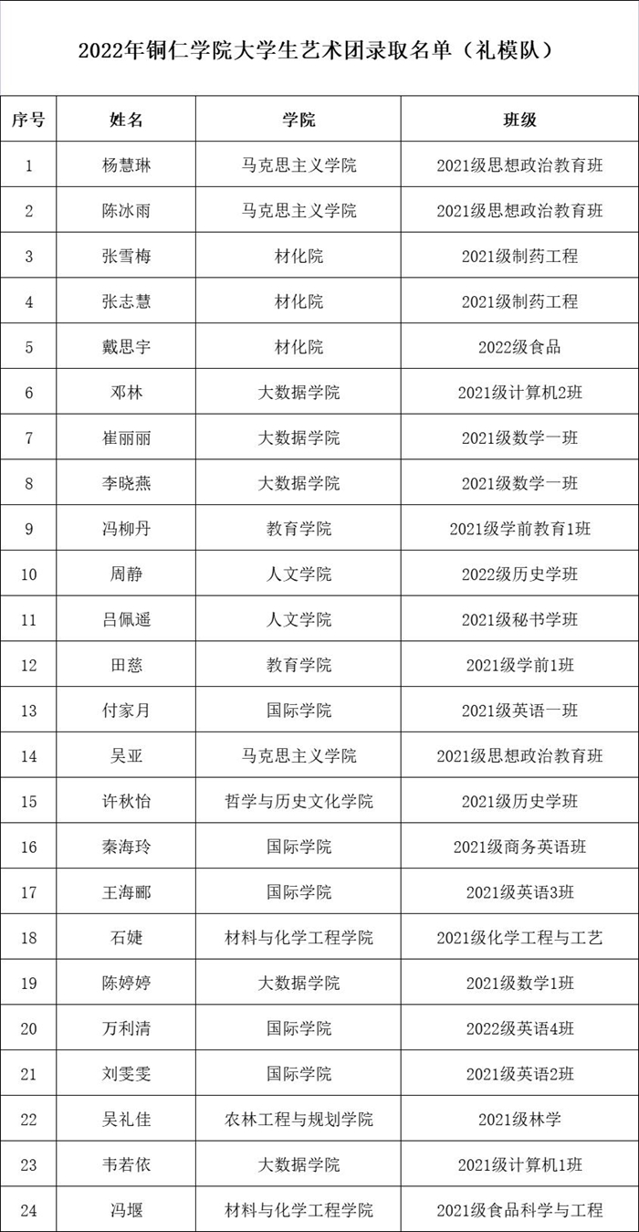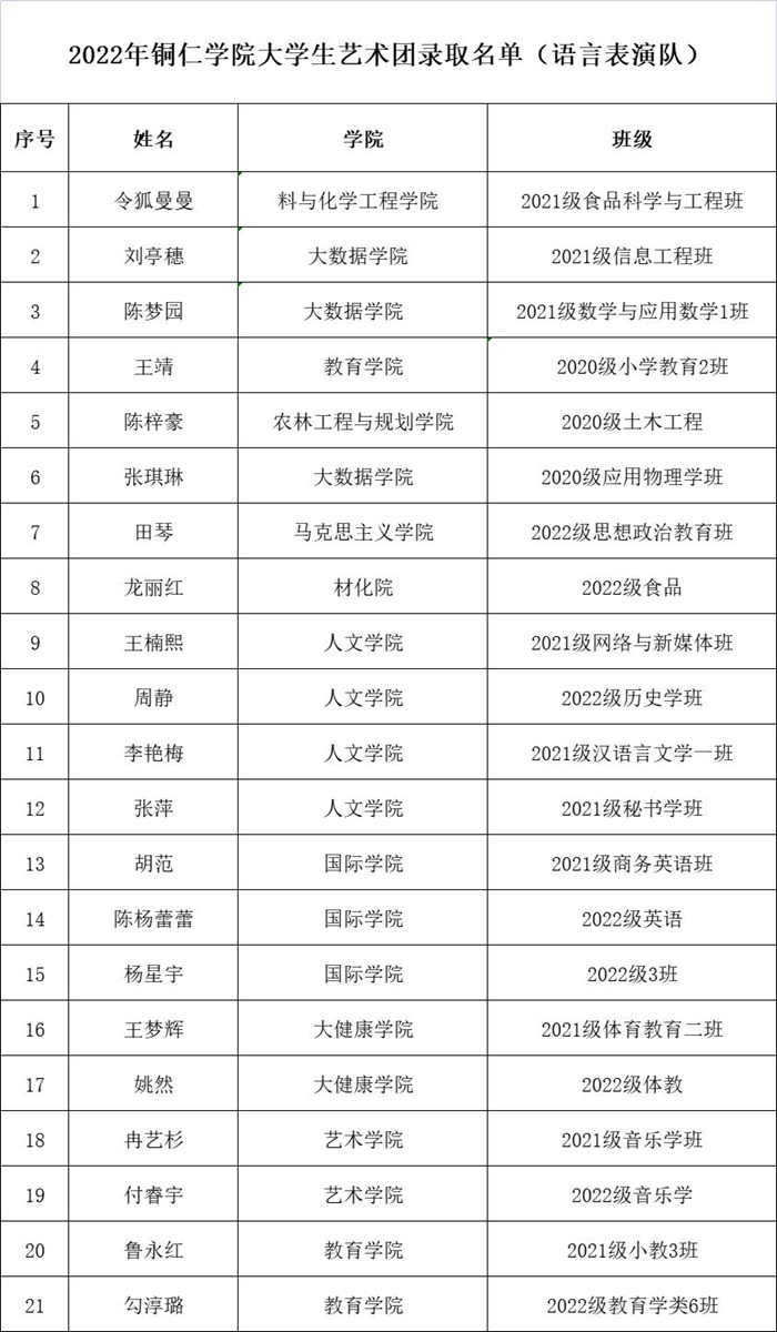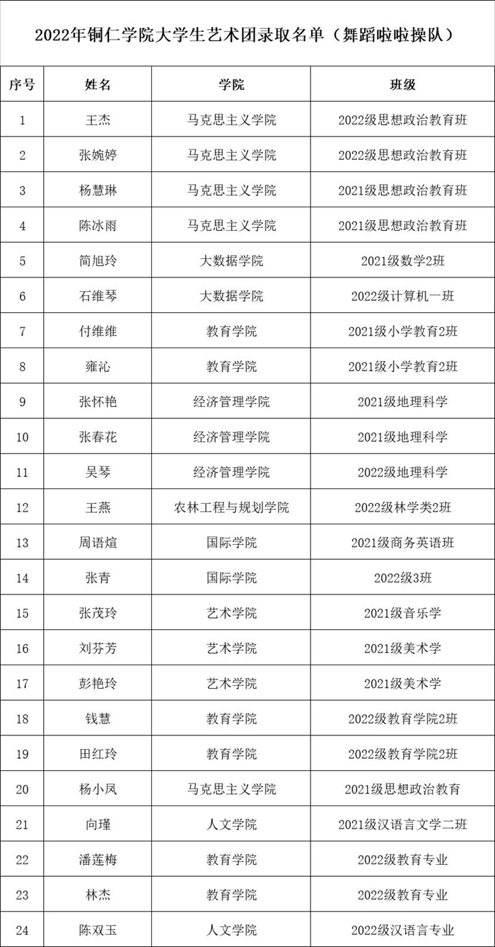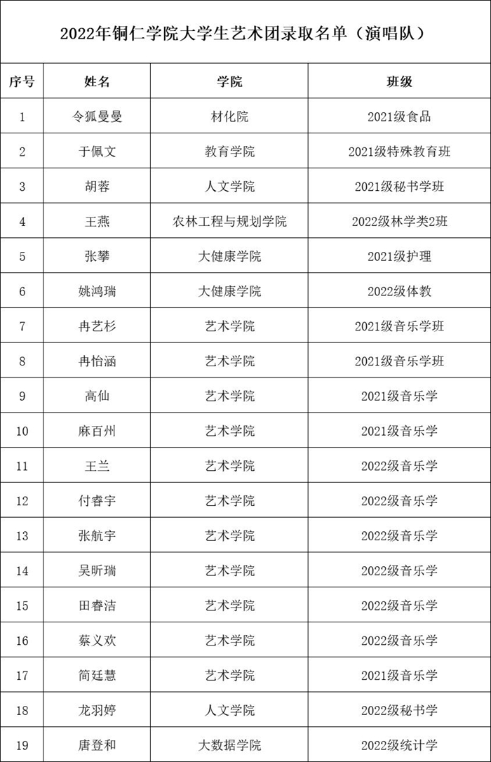 近期,beat365大学生艺术团招新工作圆满完成。经过学生自主报名、各院推荐报名等多种方式,招募语言艺术、舞蹈啦啦操、礼模、演唱等艺术爱好者,共210人报名,最终由艺术团指导教师及专业教师进行面试考核选拔,共有84名同学脱颖而出,现将录取名单予以公告(排名顺序不分先后)。