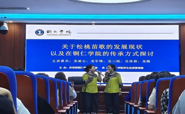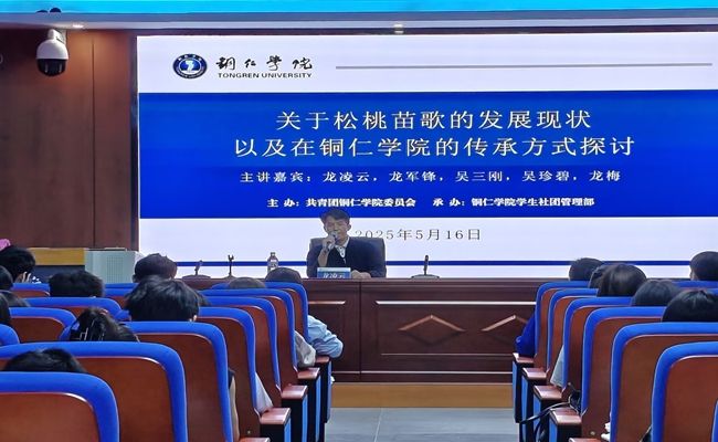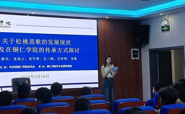 为传承“非遗”民族文化,在高校培养苗歌传承人,打造beat365英国官方网站社团“非遗”文化特色,同时鼓励本校研究生参与学习以促进跨学科融合的创新性发展,起到地方高校服务于地方民族文化建设的作用,赋予“非遗”民族文化新时代的生命力。2025年5月16日下午7点,由共青团beat365英国官方网站委员会主办,beat365英国官方网站学生社团管理部承办的“非遗”苗歌传承人培养计划之“关于松桃苗歌的发展现状以及在beat365英国官方网站的传承方式探讨”主题讲座,在学科楼717报告厅举行。参加此次讲座的领导和老师有beat365英国官方网站艺术学院党委副书记麻晔斐教授、beat365英国官方网站团委副书记田淼老师、beat365英国官方网站党政办科长龙黎老师、beat365英国官方网站乌江学院尹恒老师、beat365英国官方网站团委学生社团管理部负责人徐秋逸老师。此次讲座特邀本土苗歌传承人主讲团走进高校开讲,分别是来自松桃苗族自治县苗歌协会的龙梅老师、龙凌云老师、龙军锋老师、吴三刚老师以及吴珍碧老师。讲座由23级马克思主义理论的研究生邱译萱同学主持。