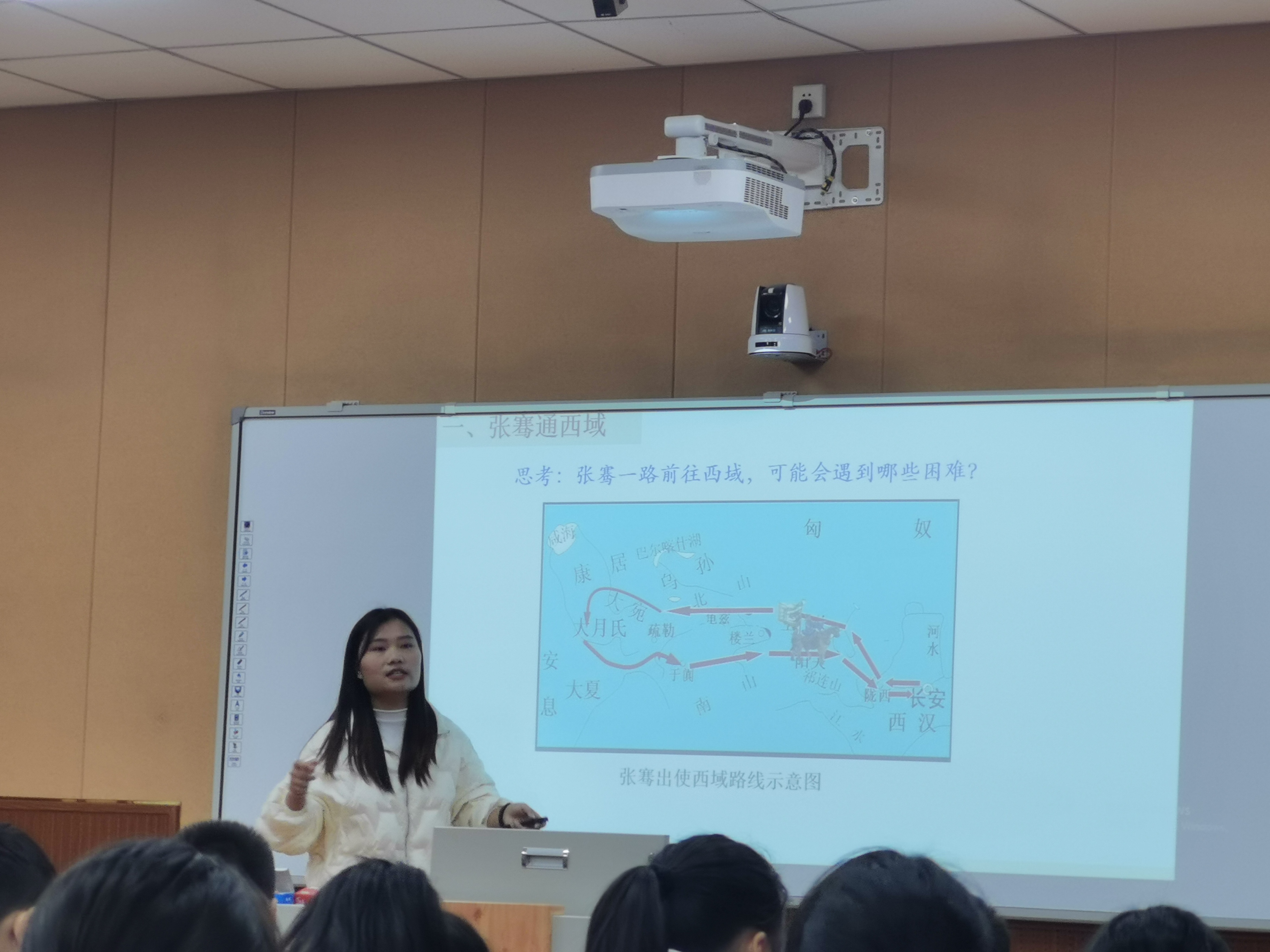 实习生龙京林以邮票为引子导入新课,围绕“张骞通西域”、“陆上丝绸之路和海上丝绸之路”等知识点展开讲授。教学过程中,运用现代教育技术手段和大量的史料、地图、图片等手段帮助学生了解、理解相关的知识,较好地完成了课堂教学任务。