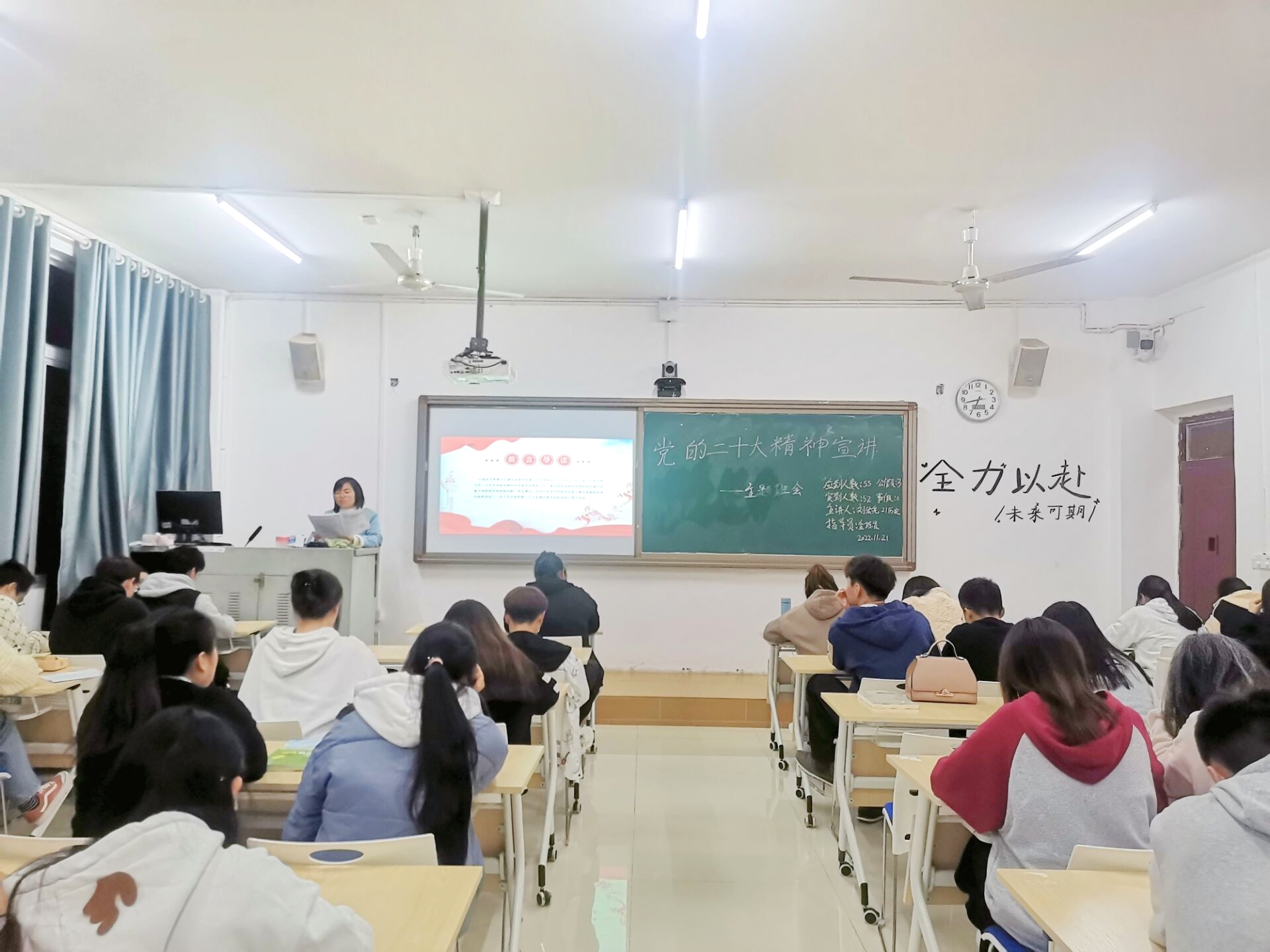 11月21日晚,贵州省最美劳动者、贵州省普通本科高校“金师”、铜仁市文明标兵、铜仁市优秀共产党员陆艳博士来到依仁楼A302教室,为2021级历史学班全体同学宣讲了党的二十大精神。宣讲会由班主任金琼霞老师主持。