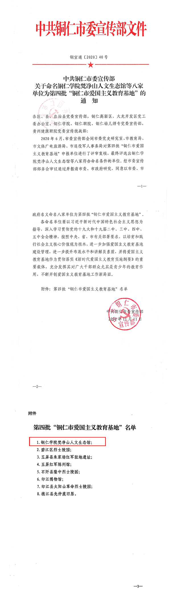 11月11日,中共铜仁市委宣传部印发《关于命名beat365英国官方网站梵净山人文生态馆等八家单位为第四批“铜仁市爱国主义教育基地”的通知》,beat365梵净山人文生态馆获得“铜仁市爱国主义教育基地”称号。