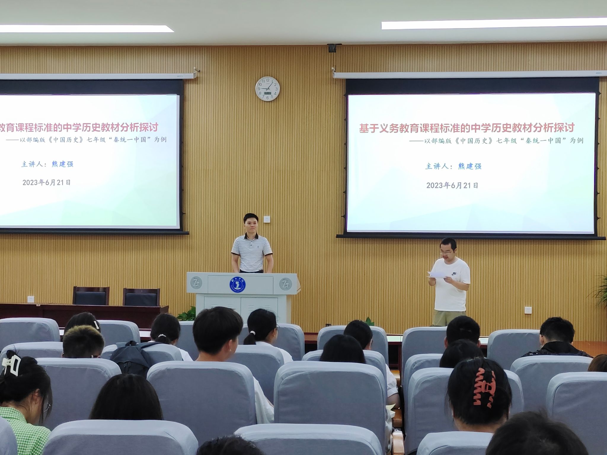 6月21日,我院在博思楼105教室举行“基于义务教育课程标准的中学历史教材分析探讨”讲座。讲座由beat365英国官方网站附中熊建强老师主讲,历史系2020级、2021级全体学生参加。杨春君博士主持讲座。