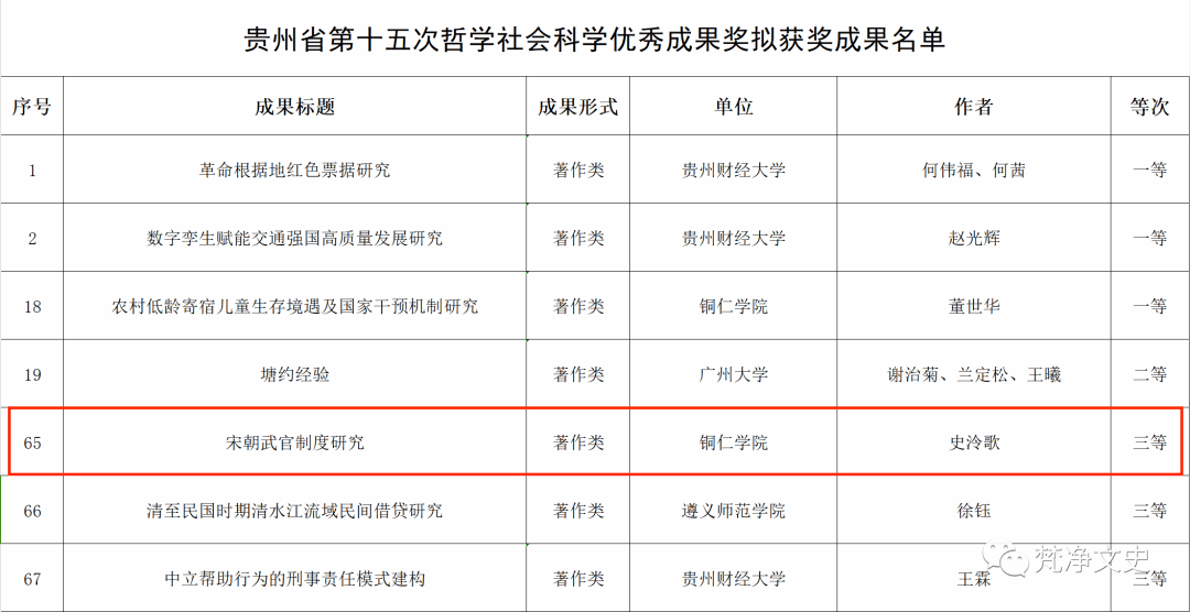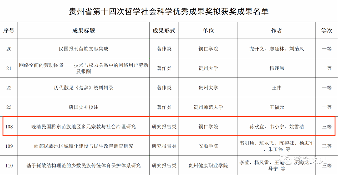 近日,贵州省社科联公示了贵州省第十四次、第十五次哲学社会科学优秀成果奖的获奖名单,哲学与历史文化学院3项科研成果获奖,其中我院龙开义教授等所著的《民国报刊苗族文献集成》获贵州省第十四次哲学社会科学优秀成果奖一等奖,蒋欢宜博士等所撰写的《晚清民国黔东苗族地区多元宗教与社会治理研究》 获贵州省第十四次哲学社会科学优秀成果奖三等奖 ,史泠歌教授的《宋朝武官制度研究》获贵州省第十五次哲学社会科学优秀成果奖三等奖。这充分彰显了我院的科研水平及科研集群优势。贵州省哲学社会科学优秀成果奖是该领域贵州省人民政府设立的最高奖项,每两年举行一次评选,以奖励在哲学社会科学研究领域取得杰出成就的个人和团队,包括学术著作、论文、研究报告和普及成果等。本次获奖的哲学社会科学优秀成果是研究重大理论问题和贵州经济社会发展中的现实问题的优秀科研成果,具有较高学术水平或应用价值,学院对获奖的教师表示热烈祝贺!同时希望我院广大教师向获奖者学习,发扬与时俱进、刻苦钻研和开拓创新的精神,努力创作出更多更好的哲学社会科学优秀成果,为进一步繁荣哲学社会科学发展贡献智慧和力量。