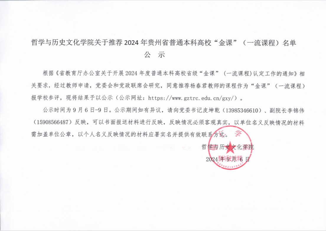 哲学与历史文化学院关于推荐2024年贵州省普通本科高校“金课”(一流课程)名单 公 示