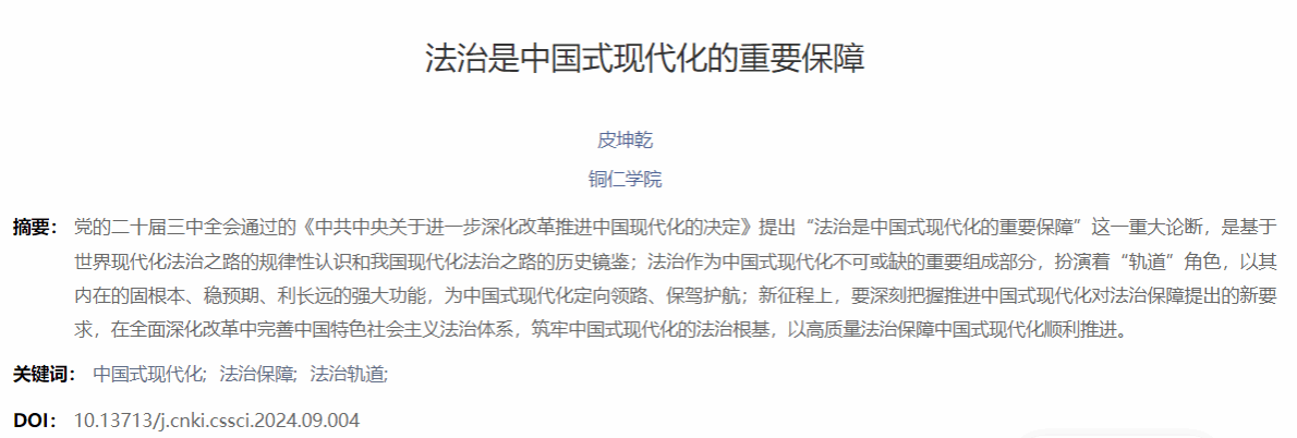 近日,中文社会科学引文索引(CSSCI)来源期刊《贵州社会科学》2024年第9期“深入学习贯彻党的二十届三中全会精神”专栏,刊发我院党委书记皮坤乾教授的研究成果《法治是中国式现代化的重要保障》。