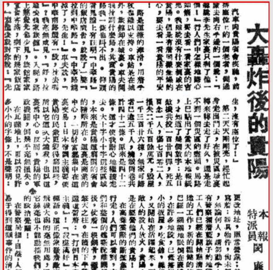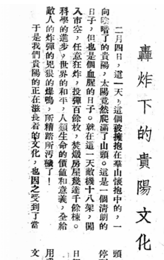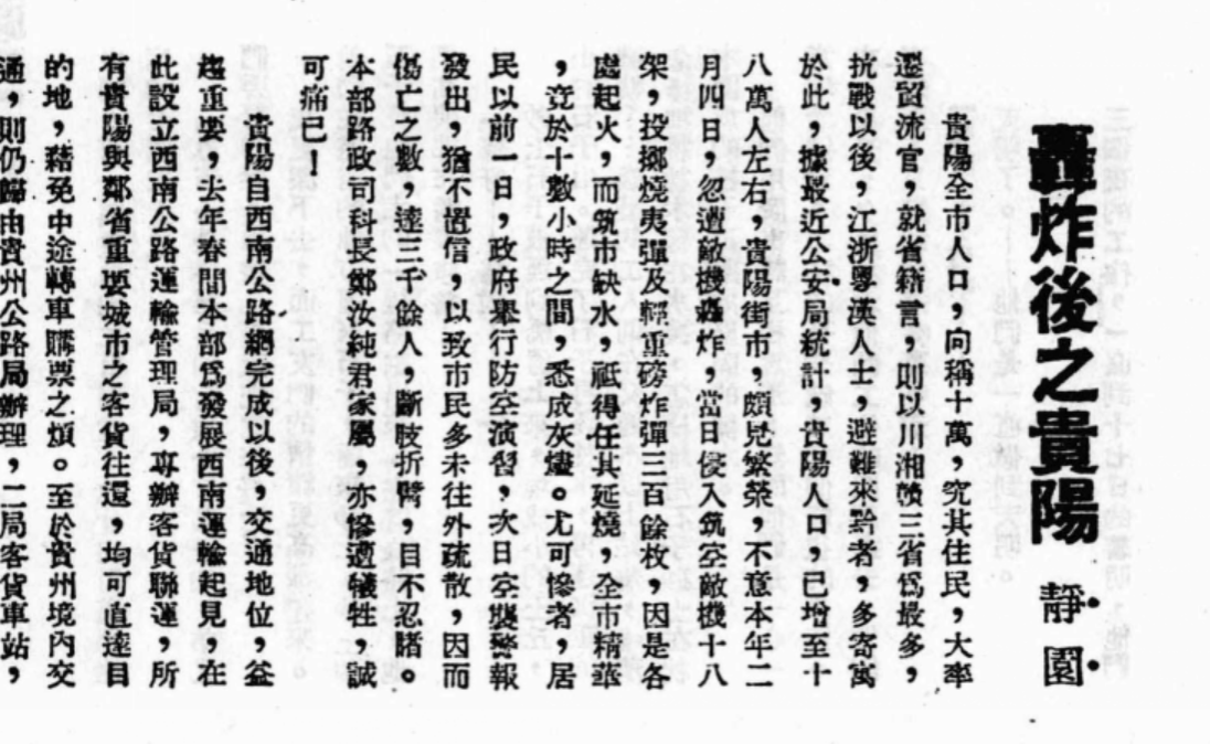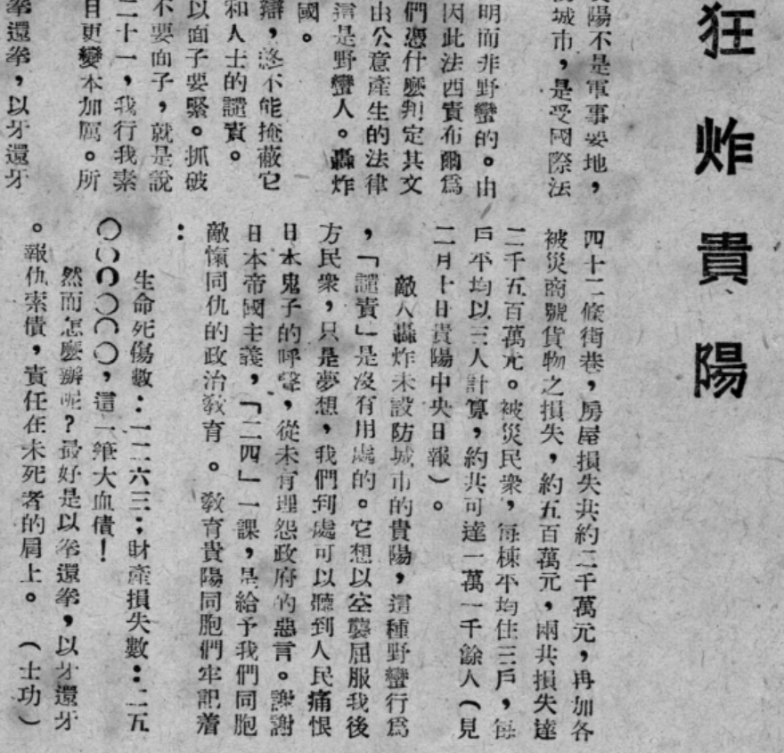 日机飞行高度约3000米,设于东山的两门高炮虽不断开火射击,但火力微弱,难以对日军飞机造成有效打击。日军飞机分两批对贵阳市区发动了大规模无差别轰炸,整个贵阳城区沉浸在一片火光之中,史称“二·四大轰炸”。此次日寇飞机共投燃烧弹和轻重磅炸弹三百余枚。由于当时贵阳城区内的房屋大都是木结构或砖木结构,极易燃烧,燃烧蔓延迅速,故人员伤亡重大。据史料记载,被毁房屋1326幢,市民死伤3000余人,损失达2500万元,被灾民众达11000余人。贵阳老城核心区几成废墟。这是贵阳设城以来最大的灾难,不仅是日军侵华罪行的铁证,也是贵州人民在抗战中付出巨大牺牲的历史见证。(下图为部分民国报刊的相关报道)