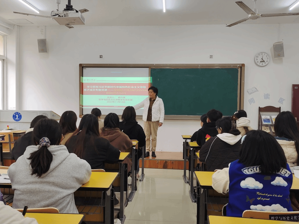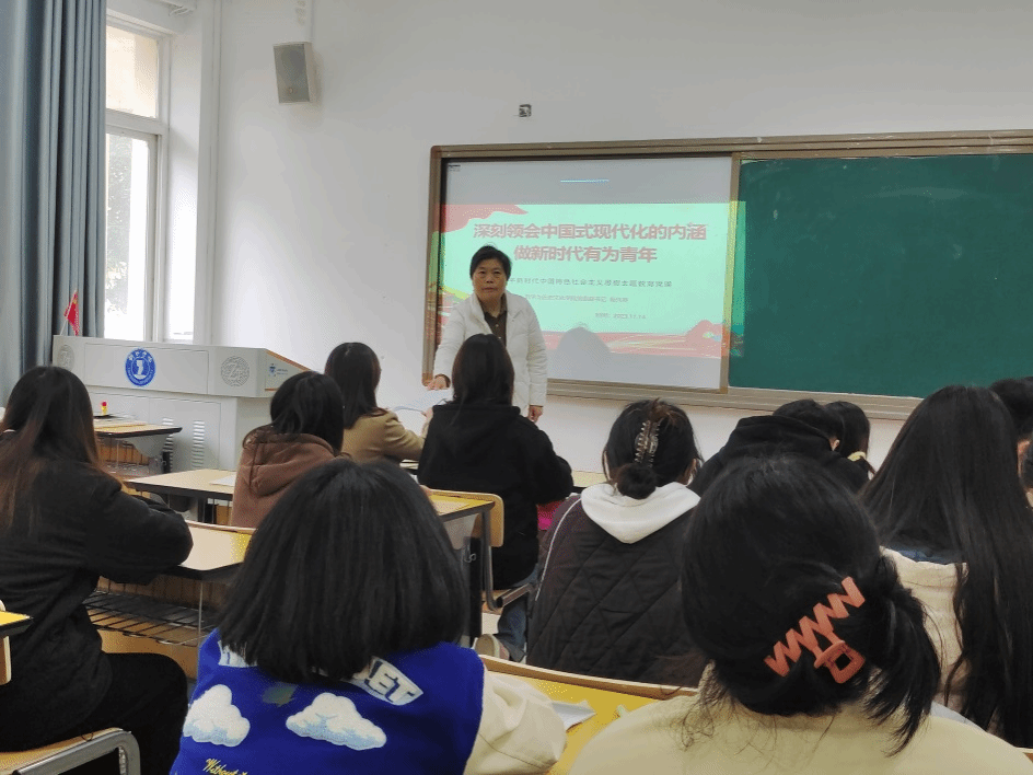 11月14日中午,我院党委书记杨兴英在依仁楼A103为学生作了题为深刻领会中国式现代化的内涵做新时代有为青年专题党课。本次党课上,杨兴英老师围绕主题从四个方面介绍作了详细的讲解。一是深刻领会中国式现代化的内涵;二是深刻认识新时代新征程的战略安排和目标任务;三是深刻领会前进道路上必须牢牢把握的重大原则;四是做新时代的有为青年。通过学习,使我们深刻意识到青年一代是民族的希望,是肩负起中华民族伟大复兴重任的接班人。我们要紧跟党的步伐,认真学习党的理论知识,把习近平新时代中国特色社会主义思想作为根本遵循、理论指导和行动指南;我们要志存高远,脚踏实地,努力学习,磨砺意志,练就过硬本领,努力成为一名合格的社会主义的建设者和接班人。