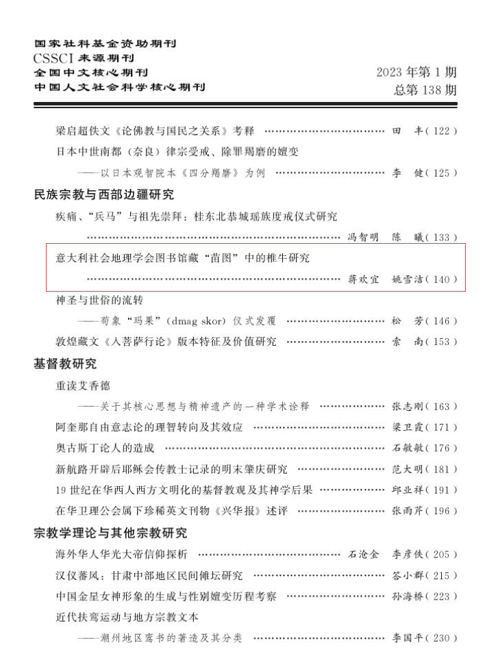 日前,《宗教学研究》第1期刊发了我院教师蒋欢宜、姚雪洁两位老师的学术论文《意大利社会地理学会图书馆藏“苗图”中的椎牛研究》。文章指出,意大利社会地理学会图书馆馆藏“苗图”是20世纪初绘制的包括“百苗图”临抄本在内的17种中国西南少数民族图志文献资料,是研究晚清民国中国西南地区民族文化和民族关系的珍贵资料。其中,F.cin_60《百苗图》和F.cin_67《贵州民族文化专题图志》中均有对椎牛祭祀场景的描图,蕴含着丰富的宗教文化讯息。文章强调,椎牛是苗族、瑶族、佤族、水族、布依族等民族共享的文化事项,以祭祖、祭丧为主要目的,是中国西南少数民族祖先崇拜的生动表达。
