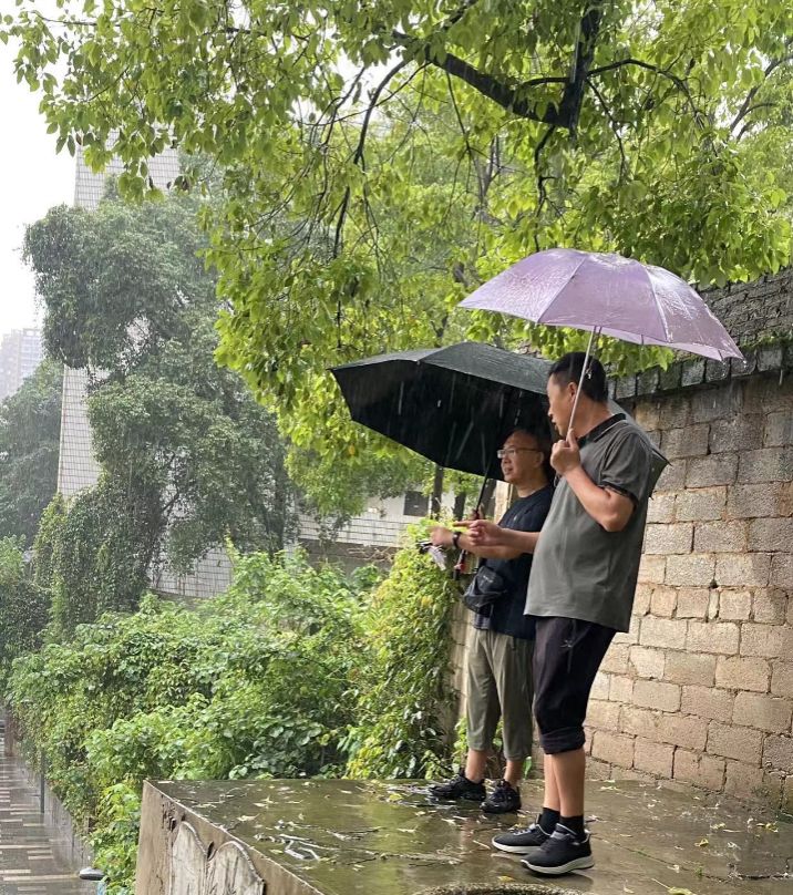 工作组在老校区巡查 维修人员防汛处理