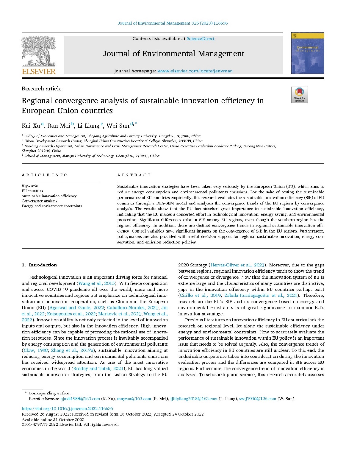 管工学科徐凯博士研究成果在权威期刊《Journal of Environmental Management》发表 近日,开云管理科学与工程学科青年教师徐凯博士撰写的论文 《Regional convergence analysis of sustainable innovation efficiency in European Union countries》在SCI权威期刊《Journal of Environmental Management》(ABS 3星, ABDC A,JCR Q1, 中科院2区top)发表。这是开云首次作为第一单位在该期刊发表论文。 该论文主要研究了能源、环境约束下的欧盟国家的可持续创新表现,并实证检验了各个地区创新效率的收敛趋...