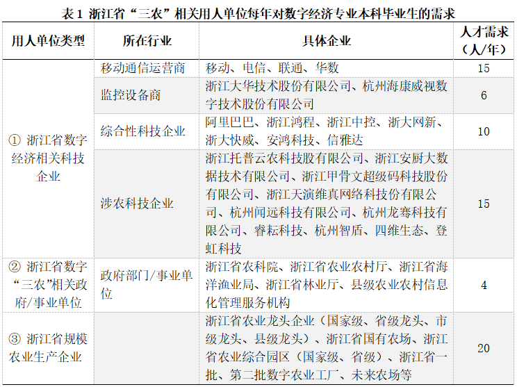浙江省正在探索以数字经济赋能共同富裕之路,旨在实现“做强做优做大数字经济”的过程中推动实现“共同富裕取得实质性进展”的目标。结合我校办学特色,通过调研与访谈,汇总出部分省内相关用人单位每年对数字经济专业本科毕业生的需求与相关岗位如表1和表2: