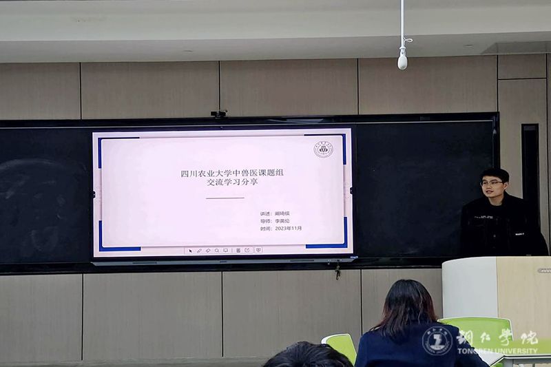此次学术交流围绕三个学术研究焦点。在中药复方防治滑液囊支原体感染的作用机制方面,阚琦缤博士深度解析了中药复方在滑液囊支原体感染防治中的作用机制,为中药疗法在临床应用提供了新的视角。在腹泻药方多糖对仔兔断奶腹泻作用方面,阚琦缤博士详细介绍了多糖类药方在仔兔断奶腹泻治疗中的效果,为解决腹泻问题提供了新的思路和方法。在苍术提取物对鼠伤寒沙门氏菌生物膜形成的抑制方面,阚琦缤博士分享了苍术提取物在抑制鼠伤寒沙门氏菌生物膜形成方面的研究成果,为天然植物提取物在防治细菌感染中的应用开辟了新的可能性。在交流会过程中,同学们积极讨论,纷纷发表了自己的观点,与阚琦缤博士一起交流讨论。
