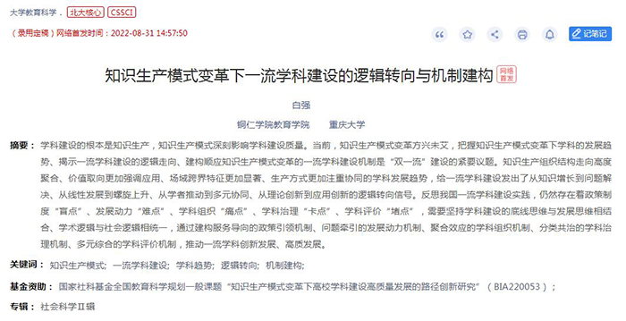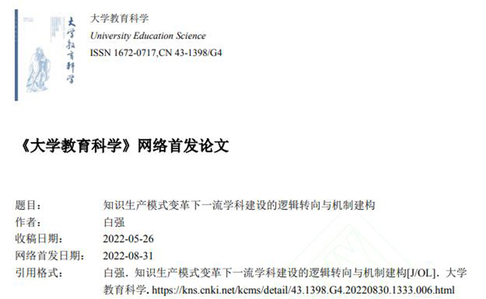 8月31日,高等教育研究领域重要学术期刊《大学教育科学》网络首发beat365白强教授的最新研究成果《知识生产模式变革下一流学科建设的逻辑转向与机制建构》,该成果将在该期刊2022年第5期纸质刊印。该成果15000字,是白强教授近年来相继发表研究成果《大学知识生产模式变革与学科建设创新》(2020年)《世界一流学科的生成逻辑与建设路径——基于中外两所大学两个一流学科生长史的考察》(2019年)《中国特色“双一流”大学建设的逻辑根据与路径选择》(2018年)等CSSCI核心来源期刊论文之后关于学科建设的最新研究成果。