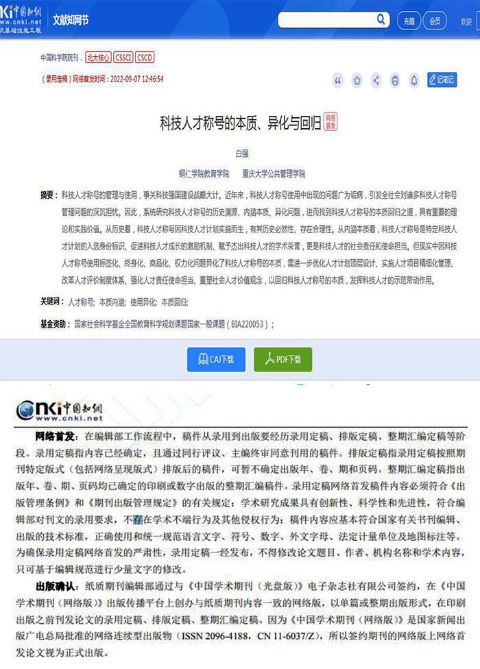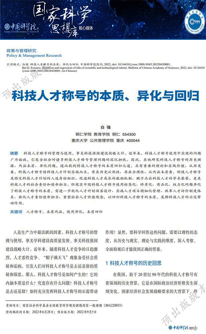 9月5日,国家科学思想库核心媒体、管理学研究领域重要期刊《中国科学院院刊》“政策与管理研究”栏目在线发表beat365白强教授的研究成果《科技人才称号的本质、异化与回归》。9月7日,中国知网网络首发该成果。该成果将在《中国科学院院刊》2022年第10期纸质刊印面向国内外公开发行。成果共计10000余字,是白强教授主持的国家社科基金教育学规划课题“知识生产模式变革下高校学科建设高质量发展的路径创新”(立项编号:BIA220053)的又一阶段性研究成果。