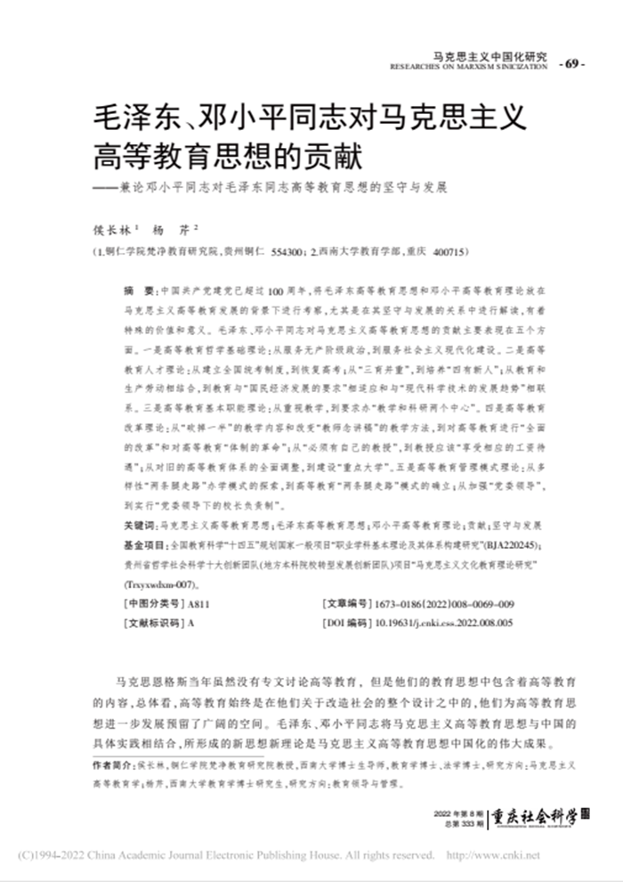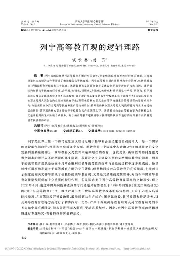 近日,beat365校长、二级教授、博士侯长林与国际学院副院长、副教授、在读博士杨芹合作的论文《列宁高等教育观的逻辑理路》《毛泽东、邓小平同志对马克思主义高等教育思想的贡献——兼论邓小平同志对毛泽东同志高等教育思想的坚守与发展》,先后发表在CSSCI来源期刊《西南大学学报》(2022年第5期)、CSSCI来源期刊扩展版《重庆社会科学》(2022年第8期),系侯长林教授主持的全国教育科学“十四五”规 划2022年度国家一般课题“职业学科基本理论及其体系构建研究”(BJA220245)的阶段性成果。