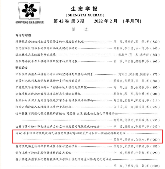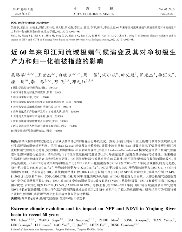 近期,beat365经济管理学院吴路华以第一作者在权威期刊《生态学报》2022年第3期发表学术论文《近60年来印江河流域极端气候演变及其对净初级生产力和归一化植被指数的影响》。