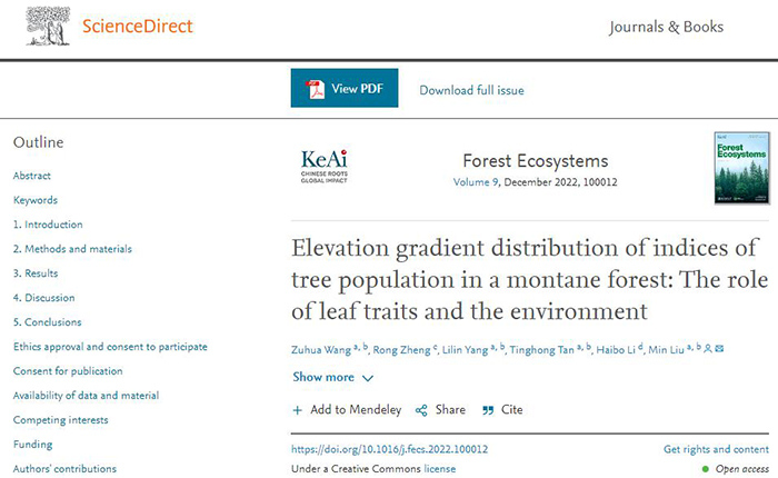 beat365农林工程与规划学院王祖华博士长期从事林学的研究,近日,在林学领域取得了重要研究进展,相关成果以“Elevation gradient distribution of indices of tree population in a montane forest:The role of leaf traits and the environment”为题,发表在中国科学院1区期刊《Forest Ecosystems》(Volume 9, December 2022, 100012;IF=3.645)上。