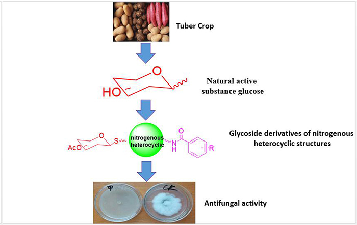 植物病害是制约农作物安全生产的主要因素之一,病害的发生不仅影响农作物的产量,还严重影响农作物的品质。马铃薯晚疫病是一种由致病疫霉引起的毁灭性植物病害,具有发生范围广、流行速度快、危害严重的特点,一般年份可减产10%~20%,危害严重的年份可达50%~70%,甚至绝收。目前,由于品种抗病性的退化,农业管理的不完善,使得马铃薯晚疫病的防治主要依赖于化学防治。用于防治马铃薯晚疫病的药剂在防治马铃薯晚疫病的同时带来了诸如:长期使用传统化学农药使病原物逐渐产生抗性,农药的使用量不断增加,使生态环境问题更加严重的问题;以及大多数传统化学杀菌剂在杀灭病原菌的同时也使有益的微生物及昆虫和害虫的天敌受到毒害的问题。因此,创制新型、高效、作用机制独特的绿色杀菌剂已成为农药研究领域的重点研究方向之一。此外,五元六元含氮杂环化合物不仅具有杀菌、除草、杀虫及抗病毒等生物活性,还具有高效、作用方式独特、对人类低毒和对环境友好等优点。同时,糖苷类化合物是植物体内的二级代谢产物,广泛存在于植物体中。研究表明,糖苷类化合物不仅具有抗菌、抗肿瘤和抗氧化等活性,在生物识别过程中还起着重要作用。