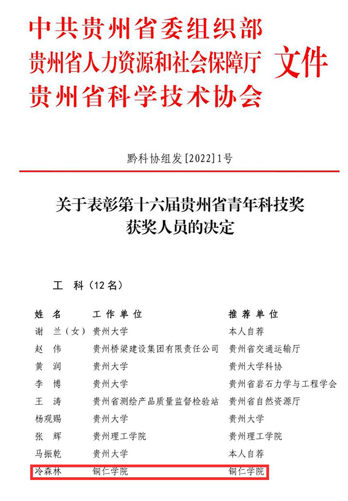 为积极响应beat365“育人为本、科研先行”发展战略,以科学研究服务学校高质量发展,beat365材料与化学工程学院冷森林教授通过基础研究与应用研究的有机结合,深耕功能电子信息材料领域,形成以地方产业发展需求为导向的特色研究方向。2010年以来,冷森林教授带领课题组攻克压电陶瓷性能与温度关系等企业面临的多个瓶颈问题,其科研成果于2022年获中共贵州省委组织部、贵州省人力资源和社会保障厅、贵州省科学技术协会联合颁发的 “第十六届贵州省青年科技奖”。