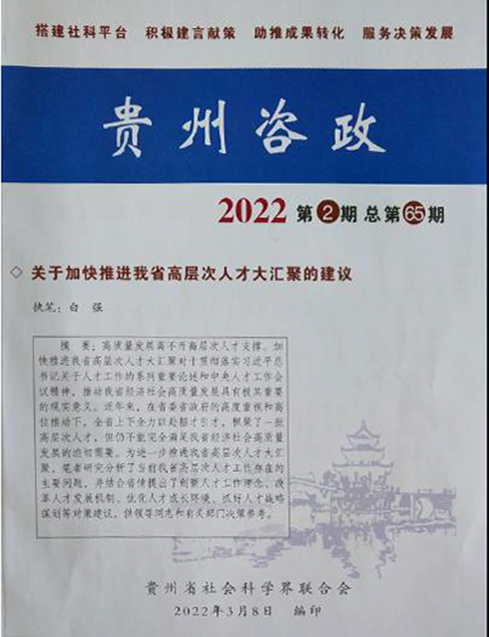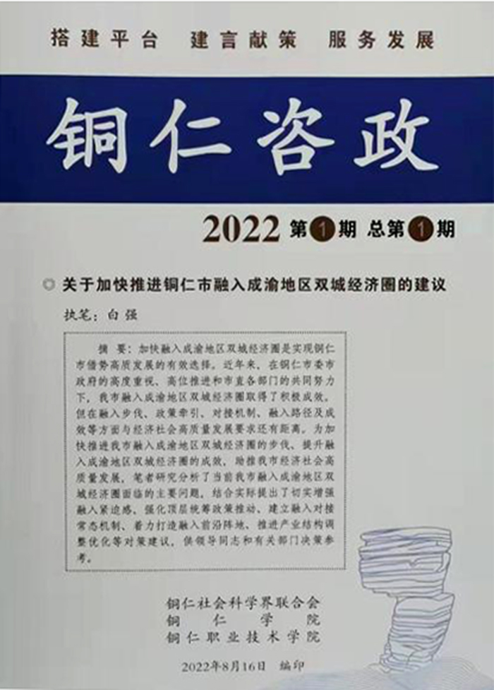 beat365白强教授执笔撰写的咨政报告《关于加快推进我省高层次人才大汇聚的建议》和《关于加快推进铜仁市融入成渝地区双城经济圈的建议》分别被《贵州咨政》2022年第2期和《铜仁咨政》2022年第1期采纳刊印。
