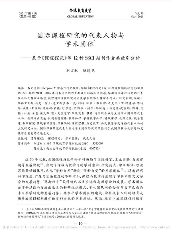 文章指出,学术团队是学科建设与发展最基本的科研组织形式,学术团队间的合作与共享已成为未来科学研究的发展趋势。笔者以CiteSpaceV信息可视化软件深度挖掘21世纪以来国际课程研究的代表性人物及其学术思想,梳理国际课程研究的主流学术团体及其学术观点。研究表明,安迪·哈格里夫斯、迈克·富兰、克里斯多弗·戴、利特、保罗·弗莱雷、迈克尔·W.阿普尔、布迪厄﹑威廉·F.派纳、达林哈蒙德、舒尔曼、黛博拉·鲍尔、玛丽莲·科克伦史密斯、博科、约翰·杜威、舍恩、施瓦布、瑾·克兰迪宁、维果茨基、温格、迈尔斯等成为主流学术团体的代表人物。教师专业发展、批判教育理论、教师知识、学科教学知识、实践课程、教师文化、概念重建、叙事探究、情境学习理论、课程编制、课程理解、历史教育、公民教育等是这些代表人物的主流研究方向。借鉴国际课程领域代表学者的学术思想与主流学术团体的学术观点,对于我国当下的课程研究具有积极的借鉴意义。