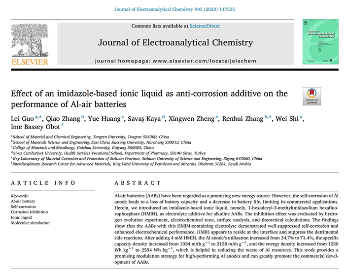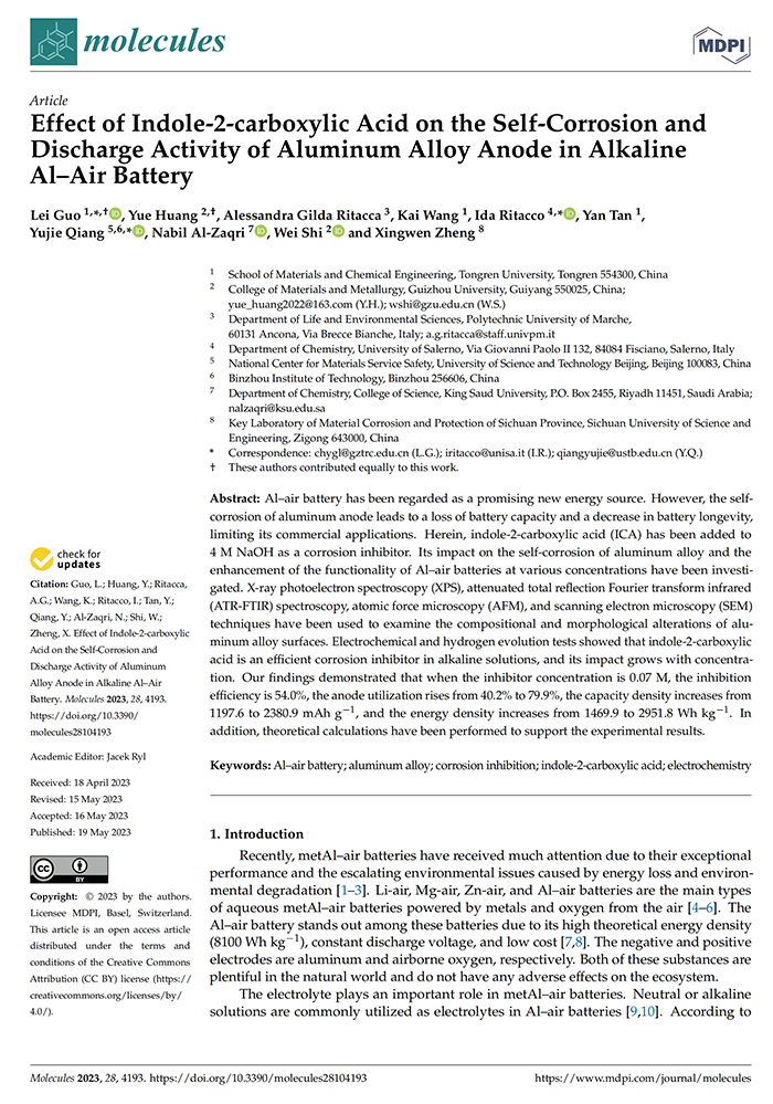 上述成果先后发表于Journal of Power Sources、Langmuir、Journal of Electroanalytical Chemistry、Molecules等高水平学术杂志。该研究高通量分子模拟及部分高精密测试分别得到了意大利CINECA超算中心、北京科技大学及贵州大学等知名高校仪器分析平台的技术支持,国家自然科学基金(22062022)、四川省材料腐蚀与防护重点实验室开放基金(2020CL06)给予了该研究财力支持。